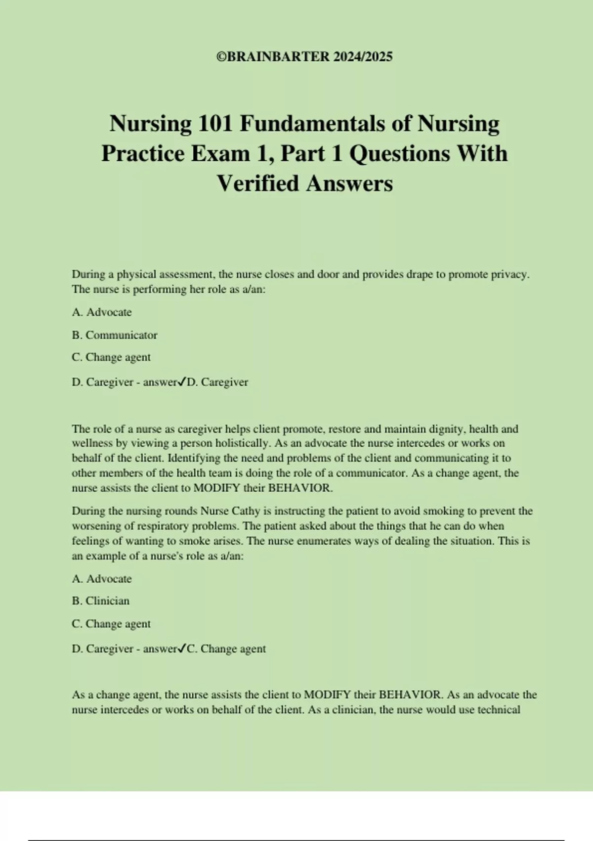 Nursing 101 Fundamentals of Nursing Practice Exam 1, Part 1 Questions With Verified Answers During a physical assessment, the nurse closes and door and provides drape to promote privacy. The nurse is performing her role as a/an: A. Advocate B. Communicator C. Change agent D. Caregiver - answerD. Caregiver The role of a nurse as caregiver helps client promote, restore and maintain dignity, health and wellness by viewing a person holistically. As an advocate the nurse intercedes or works on behalf of the client. Identifying the need and problems of the client and communicating it to other members of the health team is doing the role of a communicator. As a change agent, the nurse assists the client to MODIFY their BEHAVIOR. During the nursing rounds Nurse Cathy is instructing the patient to avoid smoking to prevent the worsening of respiratory problems. The patient asked about the things that he can do when feelings of wanting to smoke arises. The nurse enumerates ways of dealing the situation. This is an example of a nurse's role as a/an: A. Advocate B. Clinician C. Change agent D. Caregiver - answerC. Change agent As a change agent, the nurse assists the client to MODIFY their BEHAVIOR. As an advocate the nurse intercedes or works on behalf of the client. As a clinician, the nurse would use technical ©BRAINBARTER 2024/2025 expertise to administer nursing care. The role of a nurse as caregiver helps client promote, restore and maintain dignity, health and wellness by viewing a person holistically. Nurse Cathy on the other hand, knows the case immediately even before a diagnosis is done. Based on Benner's theory she is a/an: A. Novice B. Expert C. Competent D. Advanced beginner - answerB. Expert The ability to perceive something without further evidence is the development of intuition and is seen in Expert nurses. A novice nurse is governed by rules and usually inflexible. Competent nurses are planning nursing care consciously. Advanced beginners demonstrate acceptable performance. Newborn screening is done to every newborn in the Philippines. This is an example of: A. Primary prevention B. Secondary prevention C. Tertiary prevention D. Rehabilitation - answerB. Secondary prevention Promotion of early detection and early treatment of the disease is under secondary prevention. Example, breast self exam, TB screening, genetic counseling. One of Nurse Cathy's co-workers is Annie who is flexible in any given situation. Annie is performing her duties well without supervision but still needs more experience and practice to develop a consciously planned nursing care. According to Patricia Benner's category in specialization in nursing, Annie is a/an: A. Novice B. Expert C. Competent D. Advanced beginner - answerD. Advanced beginner ©BRAINBARTER 2024/2025 A- Novice is governed by rules and usually inflexible. B- Expert nurses have intuitive grasp on the situation dealt. C- Competent nurses are planning nursing care consciously. D- Advanced beginners demonstrate acceptable performance. The clinical instructor is discussing about the Nursing Process. She mentioned that when a cluster of actual or high-risk diagnosis are present because of a certain situation it is called: A. Wellness nursing diagnosis B. Actual nursing diagnosis C. Syndrome nursing diagnosis D. Risk nursing diagnosis - answerC. Syndrome nursing diagnosis Presence of both actual and high-risk diagnosis is called a syndrome nursing diagnosis. Wellness nursing diagnosis focuses on the clinical judgment on an individual from a specific to higher level of wellness. Actual diagnoses are clinical judgment of the nurse that is validated. A risk diagnosis is based on the clinical are based on clinical judgment that the client may develop vulnerability to the problem. The nurse in charge measures a patient's temperature at 101 degrees F. What is the equivalent centigrade temperature? A. 36.3 degrees C B. 37.95 degrees C C. 40.03 degrees C D. 38.01 degrees C - answerB. 37.95 To convert °F to °C use this formula, ( °F - 32 ) (0.55). While when converting °C to °F use this formula, ( °C x 1.8) + 32. Note that 0.55 is 5/9 and 1.8 is 9/5. During a change-of-shift report, it would be important for the nurse relinquishing responsibility for care of the patient to communicate. Which of the following facts to the nurse assuming responsibility for care of the patient? A. That the patient verbalized, "My headache is gone." B. That the patient's barium enema performed 3 days ago was negative C. Patient's NGT was removed 2 hours ago D. Patient's family came for a visit this morning. - answerC. Patient's NGT was removed 2 hours ago