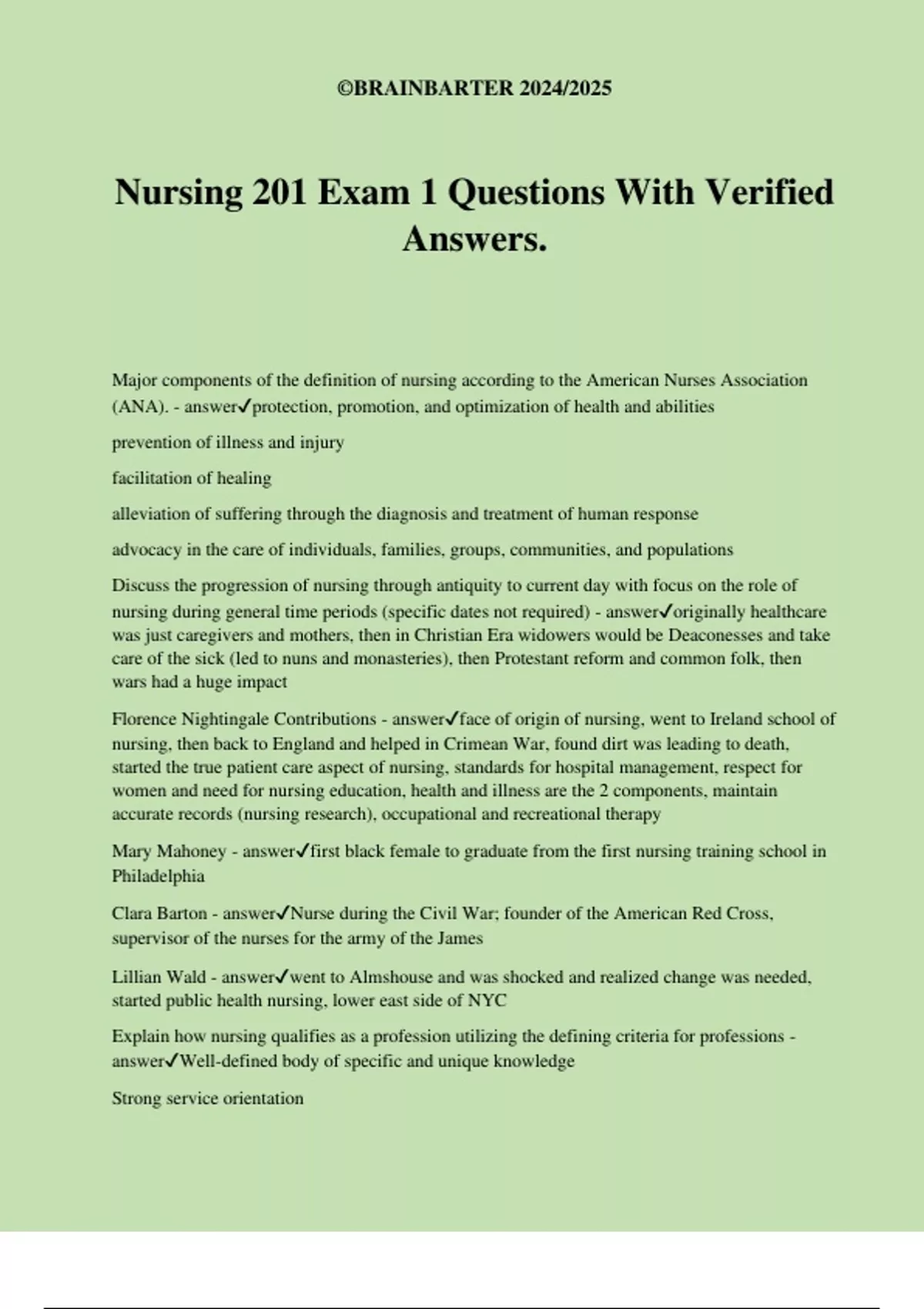 Nursing 201 Exam 1 Questions With Verified Answers. Major components of the definition of nursing according to the American Nurses Association (ANA). - answerprotection, promotion, and optimization of health and abilities prevention of illness and injury facilitation of healing alleviation of suffering through the diagnosis and treatment of human response advocacy in the care of individuals, families, groups, communities, and populations Discuss the progression of nursing through antiquity to current day with focus on the role of nursing during general time periods (specific dates not required) - answeroriginally healthcare was just caregivers and mothers, then in Christian Era widowers would be Deaconesses and take care of the sick (led to nuns and monasteries), then Protestant reform and common folk, then wars had a huge impact Florence Nightingale Contributions - answerface of origin of nursing, went to Ireland school of nursing, then back to England and helped in Crimean War, found dirt was leading to death, started the true patient care aspect of nursing, standards for hospital management, respect for women and need for nursing education, health and illness are the 2 components, maintain accurate records (nursing research), occupational and recreational therapy Mary Mahoney - answerfirst black female to graduate from the first nursing training school in Philadelphia Clara Barton - answerNurse during the Civil War; founder of the American Red Cross, supervisor of the nurses for the army of the James Lillian Wald - answerwent to Almshouse and was shocked and realized change was needed, started public health nursing, lower east side of NYC Explain how nursing qualifies as a profession utilizing the defining criteria for professions - answerWell-defined body of specific and unique knowledge Strong service orientation ©BRAINBARTER 2024/2025 Recognized authority by a professional group Code of ethics Professional organization that sets standards Ongoing research Autonomy and self-regulation Define the role of the ANA in the advancement of the profession of nursing - answerprimary mission is to advance the profession of nursing to improve health for all, has high standards for nurses with their practices and professional performance, promotes safe and ethical work environment ANA Standards of Practice - answer1. Assessment 2. Diagnosis 3. Outcomes Identification 4. Planning 5. Implementation 6. Evaluation ADOPIE ANA Standards of Professional Performance - answer1. Ethics 2. Education 3. Evidence-Based Practice and Research 4. Quality of Practice 5. Communication 6. Leadership 7. Collaboration 8. Professional Practice Evaluation 9. Resources 10. Environmental Health ©BRAINBARTER 2024/2025 Discuss the importance of the ANA Code of Ethics in nursing practice - answerit guides interactions with patients and colleagues, it focuses on these values to optimize care: altruism, autonomy, human dignity, integrity, and social justice Aims of nursing - answer1. To promote health (make sure clients have access to health care) 2. To prevent illness (warn about smoking and tanning beds) 3. To restore health (do a dressing and show patients how to) 4. To facilitate coping with disability or death (hospice) Nurse Practice Act - answerlaw established to regulate nursing practice by the state, most include defining the legal scope, have a state board that makes rules and regulations, and determine licensure nursing process - answerintegrates the art and science of nursing; assess, diagnose, plan, implement, evaluate; use critical thinking and clinical reasoning to provide individualized and holistic care practical and vocational nursing education - answerLPN, most programs are one year and they take NCLEX- PN (practical nursing) at the end, have to work under a health care provider or RN Diploma in Nursing - answertypically 3 years of hospital education, first schools of nursing did it this way Associate degree of Nursing - answerdegree offered as culmination of a 2 year program that includes some liberal arts and sciences curriculum but focuses more on nursing (junior or community colleges). attracts mostly men or minorities, ADN baccalaureate of nursing - answeroutcomes are better with a BSN, Push for nurses to go through BSN so they are more prepared, 4-year degree, nursing at the upper level Masters in Nursing - answeradvanced practice nurses (APRN) that can educate, be managers, clinical specialists, or nurse-midwives and nurse practitioners. You can specialize such as with family nurse practitioners (FNP) or become at clinical nurse leader (CNL) Doctorate of nursing practice (DNP) - answerfor practice in advanced clinical roles such as CNP or CNM -may provide a solution to shortage of primary care physicians focus on process improvement of skills or actions, performance improvement and prevention methods PhD in Nursing - answerConducts theory testing and theory development research for nursing science development; frames practice, administration, or research in nursing works