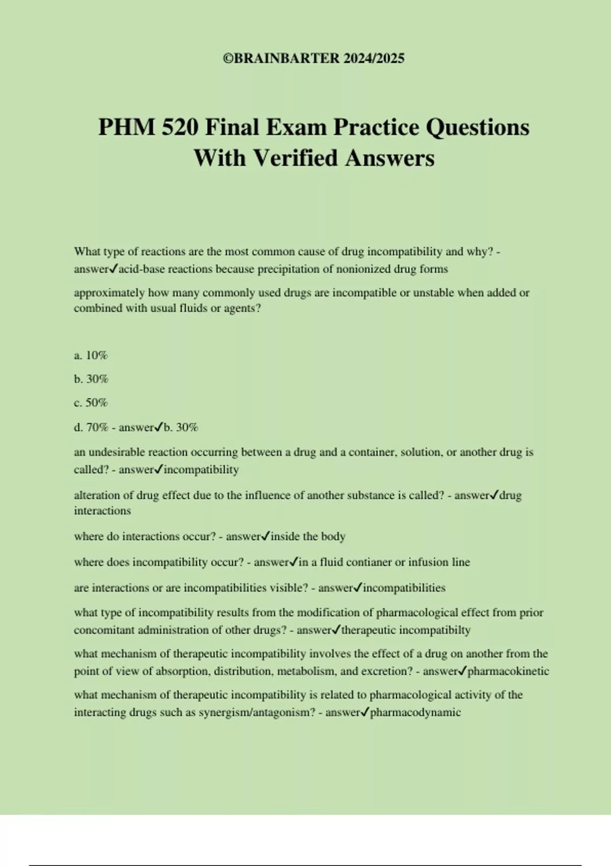 PHM 520 Final Exam Practice Questions With Verified Answers What type of reactions are the most common cause of drug incompatibility and why? - answeracid-base reactions because precipitation of nonionized drug forms approximately how many commonly used drugs are incompatible or unstable when added or combined with usual fluids or agents? a. 10% b. 30% c. 50% d. 70% - answerb. 30% an undesirable reaction occurring between a drug and a container, solution, or another drug is called? - answerincompatibility alteration of drug effect due to the influence of another substance is called? - answerdrug interactions where do interactions occur? - answerinside the body where does incompatibility occur? - answerin a fluid contianer or infusion line are interactions or are incompatibilities visible? - answerincompatibilities what type of incompatibility results from the modification of pharmacological effect from prior concomitant administration of other drugs? - answertherapeutic incompatibilty what mechanism of therapeutic incompatibility involves the effect of a drug on another from the point of view of absorption, distribution, metabolism, and excretion? - answerpharmacokinetic what mechanism of therapeutic incompatibility is related to pharmacological activity of the interacting drugs such as synergism/antagonism? - answerpharmacodynamic ©BRAINBARTER 2024/2025 pharmacodynamic is what the _______ does to the _______ - answerdrug, body pharmacokinetic is what the _______ does to the ________ - answerbody, drug an interaction that results in change in color, odor, taste, viscosity, and morphology is what type of incompatibility? - answerphysical incompatibility physical incompatibilities usually refer to? - answerprecipitation or phase separation what are factors responsible for physical incompatibility? - answerpH value and buffer capacity, solubility and precipitation, complex formation, adsorption what effect will ingestion of antacids over a period of 24 hours have on urinary pH? - answerincrease pH are acidic drugs excreted faster or slower when urinary pH is alkaline? - answerfaster acidic drugs will diffuse back into the blood from the urine when the urine is acidic or alkaline? - answeracidic interactions between ionized drugs will form _______ with _______ charges - answercomplexes, reduced cation-anion interactions result in? - answerformation of relatively insoluble precipitate ion pair formation results in? - answerburying of charges what is the interaction between a metal atom or ion and another species called? - answerchelation the attachment of a molecule to a surface is called? - answeradsorption what type of incompatibility results in change in chemical properties of pharmaceutical dosage form? - answerchemical incompatibility hydrolysis, oxidation, reduction, racemization are types of what incompatibility? - answerchemical which types of solubilization methods use a means of entrapment? a) complexation b) micellar c) hydrotrophy ©BRAINBARTER 2024/2025 d) a and b e) all of the above - answer*d) a and b which of the following expresses the number of moles of solute in 1 kg of solvent? a) molarity (M) b) molality (m) c) normality (N) d) mole fraction - answer*b) molality (m) a is incorrect because molarity expresses the number of moles of solute in 1 liter of SOLUTION c is wrong because it expresses the number of equivalents of solute in 1 liter of solution d is wrong because it expresses the ratio of moles of constituent to total moles driving force in drug movement in aqueous diffusion model: a) active transport b) facilitated transport c) concentration gradient d) all of the above - answer*c) concentration gradient which are most likely to diffuse across membranes: a) charged drugs b) ionized drugs c) polar drugs d) non-ionized drugs - answer*d) non-ionized drugs
