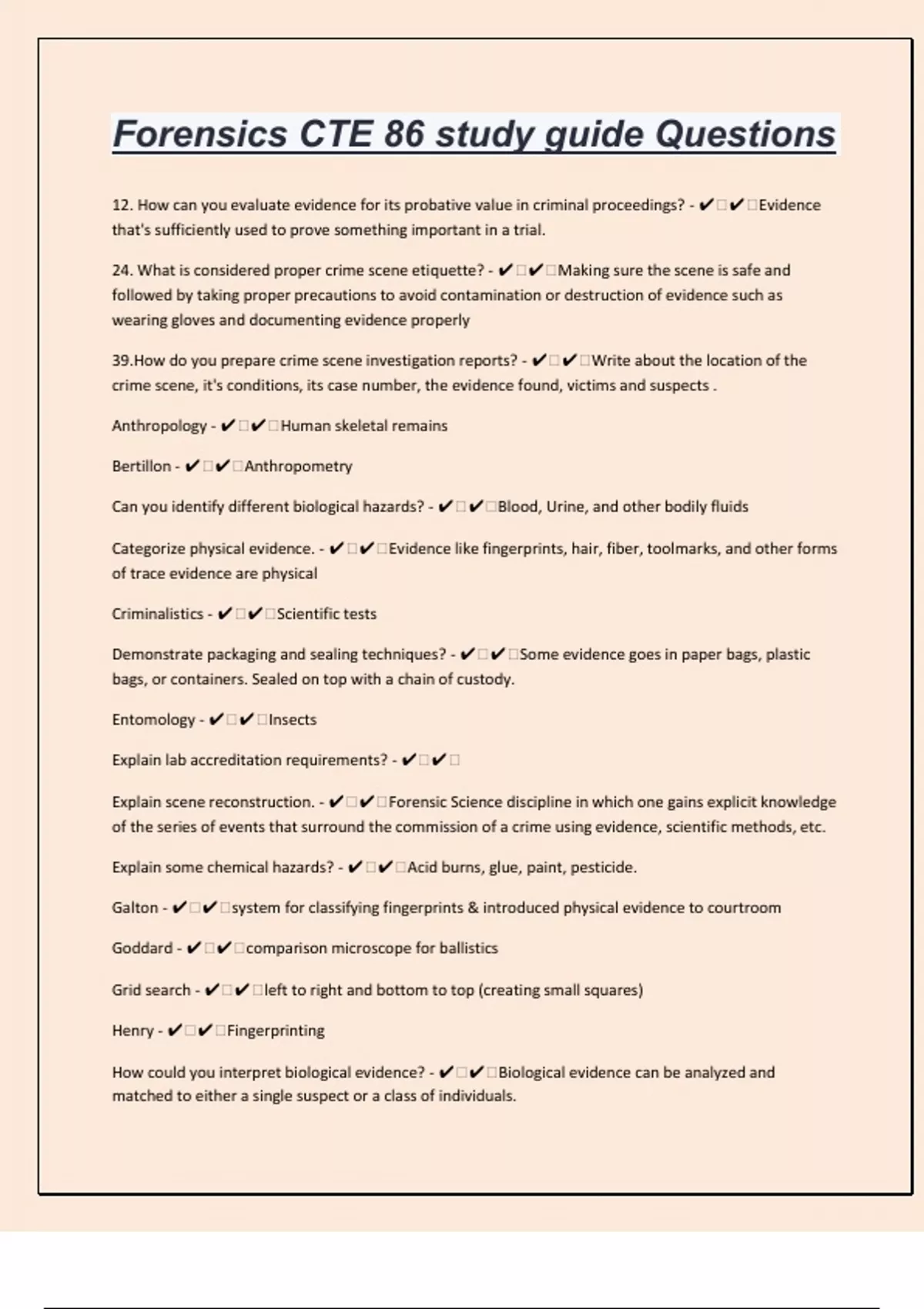 12. How can you evaluate evidence for its probative value in criminal proceedings? - ️️Evidence that's sufficiently used to prove something important in a trial. 24. What is considered proper crime scene etiquette? - ️️Making sure the scene is safe and followed by taking proper precautions to avoid contamination or destruction of evidence such as wearing gloves and documenting evidence properly 39.How do you prepare crime scene investigation reports? - ️️Write about the location of the crime scene, it's conditions, its case number, the evidence found, victims and suspects . Anthropology - ️️Human skeletal remains Bertillon - ️️Anthropometry Can you identify different biological hazards? - ️️Blood, Urine, and other bodily fluids Categorize physical evidence. - ️️Evidence like fingerprints, hair, fiber, toolmarks, and other forms of trace evidence are physical Criminalistics - ️️Scientific tests Demonstrate packaging and sealing techniques? - ️️Some evidence goes in paper bags, plastic bags, or containers. Sealed on top with a chain of custody. Entomology - ️️Insects Explain lab accreditation requirements? - ️️ Explain scene reconstruction. - ️️Forensic Science discipline in which one gains explicit knowledge of the series of events that surround the commission of a crime using evidence, scientific methods, etc. Explain some chemical hazards? - ️️Acid burns, glue, paint, pesticide. Galton - ️️system for classifying fingerprints & introduced physical evidence to courtroom Goddard - ️️comparison microscope for ballistics Grid search - ️️left to right and bottom to top (creating small squares) Henry - ️️Fingerprinting How could you interpret biological evidence? - ️️Biological evidence can be analyzed and matched to either a single suspect or a class of individuals.