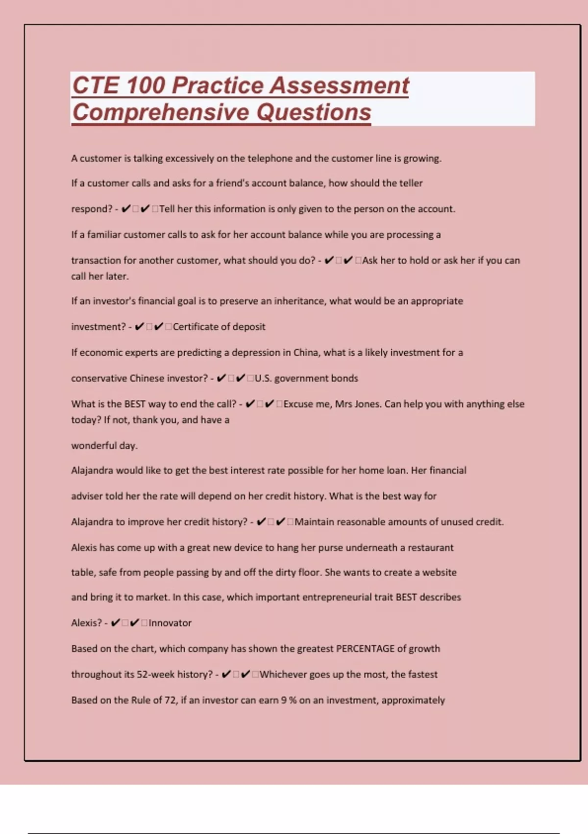 A customer is talking excessively on the telephone and the customer line is growing. If a customer calls and asks for a friend's account balance, how should the teller respond? - ️️Tell her this information is only given to the person on the account. If a familiar customer calls to ask for her account balance while you are processing a transaction for another customer, what should you do? - ️️Ask her to hold or ask her if you can call her later. If an investor's financial goal is to preserve an inheritance, what would be an appropriate investment? - ️️Certificate of deposit If economic experts are predicting a depression in China, what is a likely investment for a conservative Chinese investor? - ️️U.S. government bonds What is the BEST way to end the call? - ️️Excuse me, Mrs Jones. Can help you with anything else today? If not, thank you, and have a wonderful day. Alajandra would like to get the best interest rate possible for her home loan. Her financial adviser told her the rate will depend on her credit history. What is the best way for Alajandra to improve her credit history? - ️️Maintain reasonable amounts of unused credit. Alexis has come up with a great new device to hang her purse underneath a restaurant table, safe from people passing by and off the dirty floor. She wants to create a website and bring it to market. In this case, which important entrepreneurial trait BEST describes Alexis? - ️️Innovator Based on the chart, which company has shown the greatest PERCENTAGE of growth throughout its 52-week history? - ️️Whichever goes up the most, the fastest Based on the Rule of 72, if an investor can earn 9 % on an investment, approximately