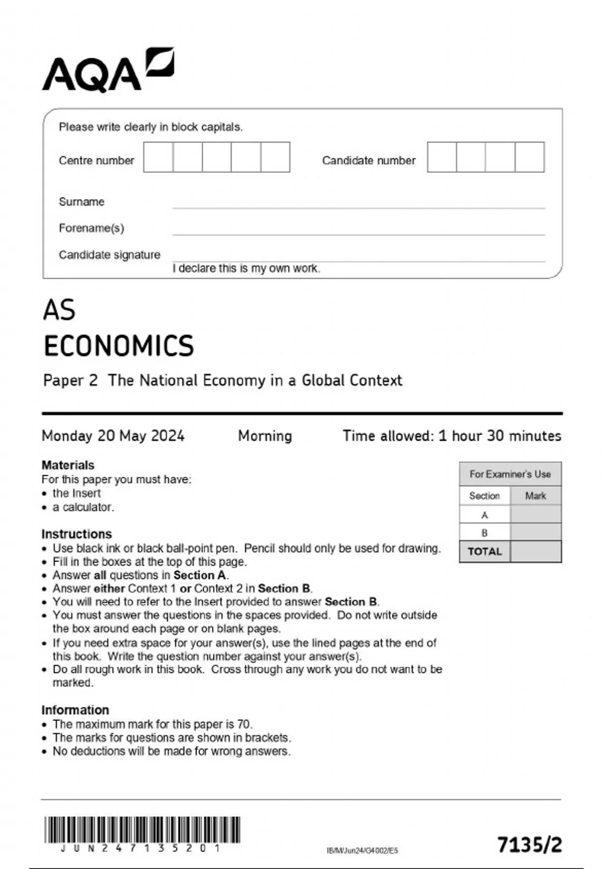 AQA AS ECONOMICS Paper 2 The National Economy in a Global Context Question Paper | 2024