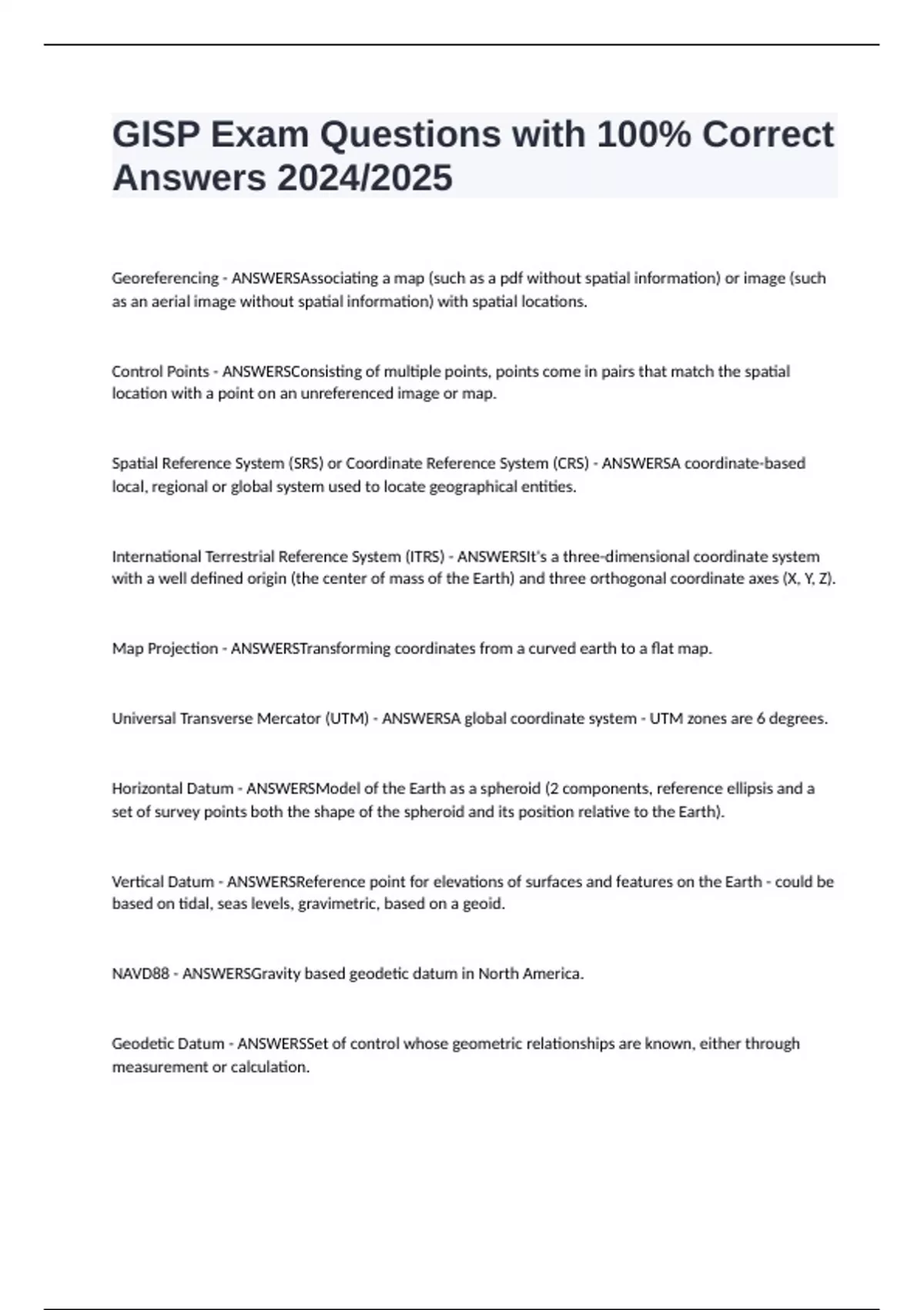 GISP Exam Questions with 100% Correct Answers 2024/2025 Georeferencing - ANSWERSAssociating a map (such as a pdf without spatial information) or image (such as an aerial image without spatial information) with spatial locations. Control Points - ANSWERSConsisting of multiple points, points come in pairs that match the spatial location with a point on an unreferenced image or map. Spatial Reference System (SRS) or Coordinate Reference System (CRS) - ANSWERSA coordinate-based local, regional or global system used to locate geographical entities. International Terrestrial Reference System (ITRS) - ANSWERSIt's a three-dimensional coordinate system with a well defined origin (the center of mass of the Earth) and three orthogonal coordinate axes (X, Y, Z). Map Projection - ANSWERSTransforming coordinates from a curved earth to a flat map. Universal Transverse Mercator (UTM) - ANSWERSA global coordinate system - UTM zones are 6 degrees. Horizontal Datum - ANSWERSModel of the Earth as a spheroid (2 components, reference ellipsis and a set of survey points both the shape of the spheroid and its position relative to the Earth). Vertical Datum - ANSWERSReference point for elevations of surfaces and features on the Earth - could be based on tidal, seas levels, gravimetric, based on a geoid. NAVD88 - ANSWERSGravity based geodetic datum in North America. Geodetic Datum - ANSWERSSet of control whose geometric relationships are known, either through measurement or calculation.
