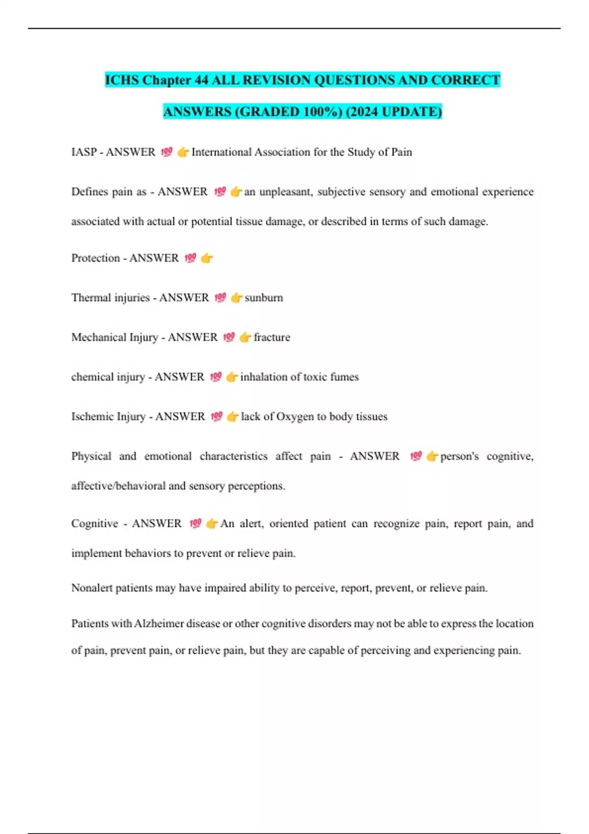 Defines pain as - ANSWER an unpleasant, subjective sensory and emotional experience
