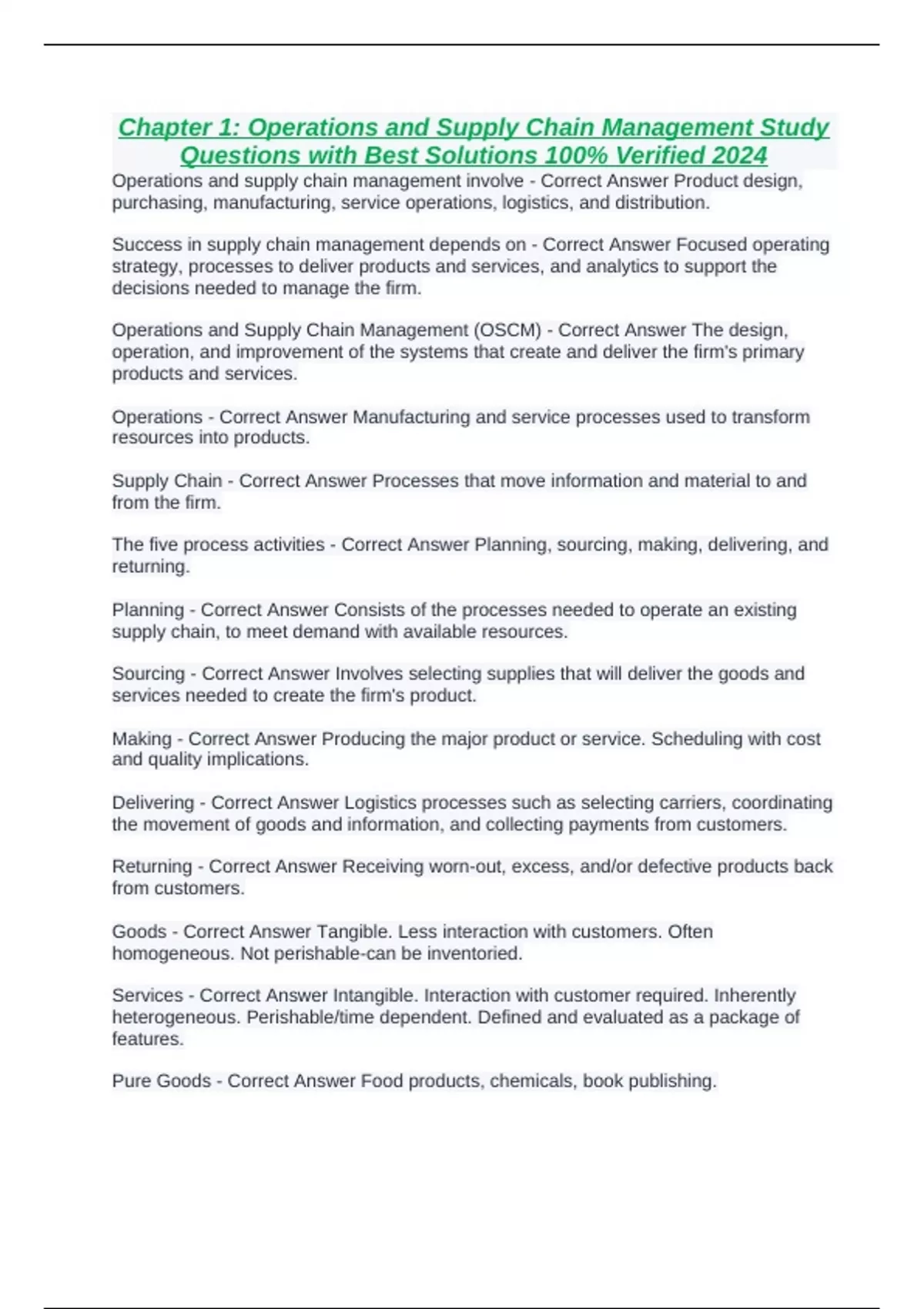 Chapter 1: Operations and Supply Chain Management Study Questions with Best Solutions 100% Verified 2024 Operations and supply chain management involve - Correct Answer Product design, purchasing, manufacturing, service operations, logistics, and distribution. Success in supply chain management depends on - Correct Answer Focused operating strategy, processes to deliver products and services, and analytics to support the decisions needed to manage the firm. Operations and Supply Chain Management (OSCM) - Correct Answer The design, operation, and improvement of the systems that create and deliver the firm's primary products and services. Operations - Correct Answer Manufacturing and service processes used to transform resources into products. Supply Chain - Correct Answer Processes that move information and material to and from the firm. The five process activities - Correct Answer Planning, sourcing, making, delivering, and returning. Planning - Correct Answer Consists of the processes needed to operate an existing supply chain, to meet demand with available resources. Sourcing - Correct Answer Involves selecting supplies that will deliver the goods and services needed to create the firm's product. Making - Correct Answer Producing the major product or service. Scheduling with cost and quality implications. Delivering - Correct Answer Logistics processes such as selecting carriers, coordinating the movement of goods and information, and collecting payments from customers. Returning - Correct Answer Receiving worn-out, excess, and/or defective products back from customers. Goods - Correct Answer Tangible. Less interaction with customers. Often homogeneous. Not perishable-can be inventoried. Services - Correct Answer Intangible. Interaction with customer required. Inherently heterogeneous. Perishable/time dependent. Defined and evaluated as a package of features. Pure Goods - Correct Answer Food products, chemicals, book publishing.