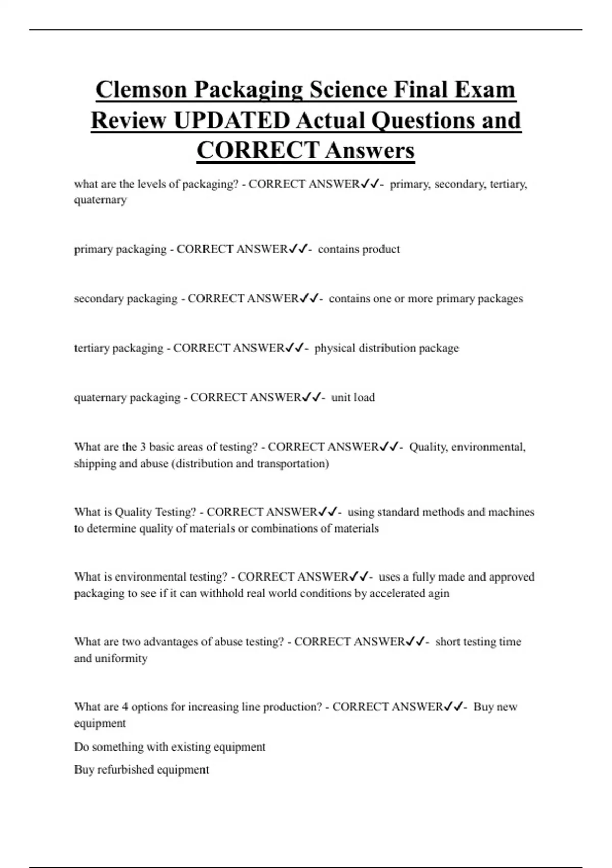 Clemson Packaging Science Final Exam Review UPDATED Actual Questions and CORRECT Answers what are the levels of packaging? - CORRECT ANSWER- primary, secondary, tertiary, quaternary primary packaging - CORRECT ANSWER- contains product secondary packaging - CORRECT ANSWER- contains one or more primary packages tertiary packaging - CORRECT ANSWER- physical distribution package