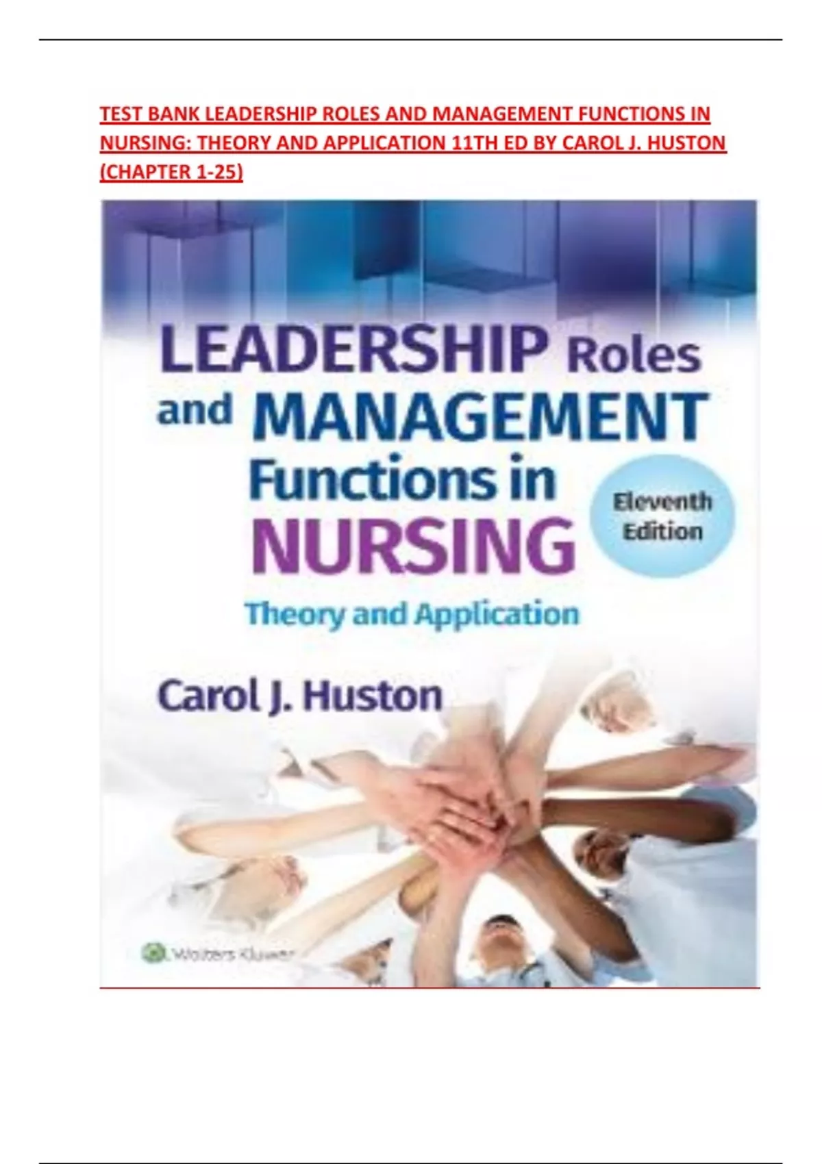 TEST BANK LEADERSHIP ROLES AND MANAGEMENT FUNCTIONS IN NURSING: THEORY AND APPLICATION 11TH ED TEST BANK LEADERSHIP ROLES AND MANAGEMENT FUNCTIONS IN NURSING: THEORY AND APPLICATION 11TH ED