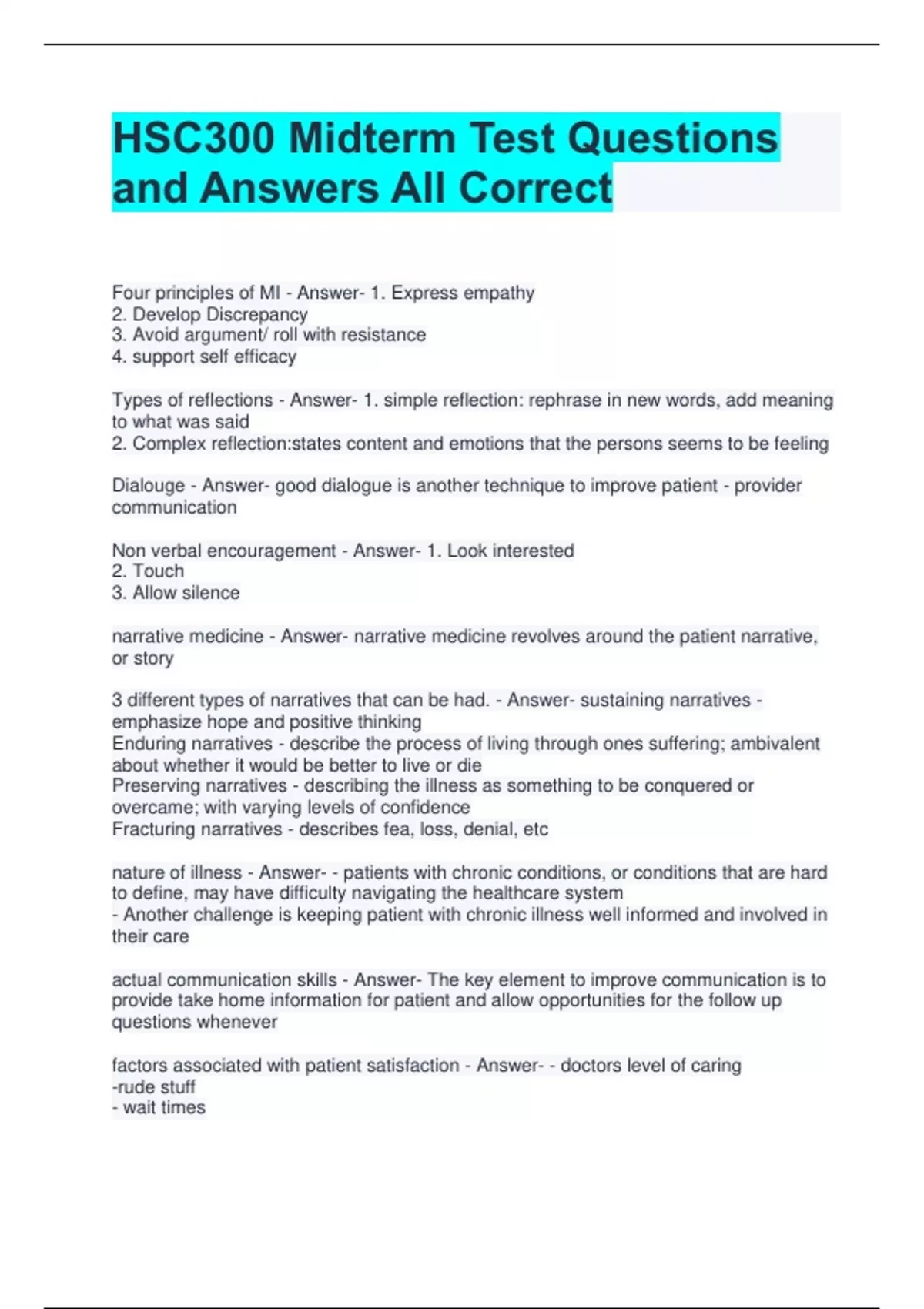 HSC300 Midterm Test Questions and Answers All Correct Four principles of MI - Answer- 1. Express empathy 2. Develop Discrepancy 3. Avoid argument/ roll with resistance 4. support self efficacy Types of reflections - Answer- 1. simple reflection: rephrase in new words, add meaning to what was said 2. Complex reflection:states content and emotions that the persons seems to be feeling Dialouge - Answer- good dialogue is another technique to improve patient - provider communication Non verbal encouragement - Answer- 1. Look interested 2. Touch 3. Allow silence narrative medicine - Answer- narrative medicine revolves around the patient narrative, or story 3 different types of narratives that can be had. - Answer- sustaining narratives - emphasize hope and positive thinking Enduring narratives - describe the process of living through ones suffering; ambivalent about whether it would be better to live or die Preserving narratives - describing the illness as something to be conquered or overcame; with varying levels of confidence Fracturing narratives - describes fea, loss, denial, etc nature of illness - Answer- - patients with chronic conditions, or conditions that are hard to define, may have difficulty navigating the healthcare system - Another challenge is keeping patient with chronic illness well informed and involved in their care actual communication skills - Answer- The key element to improve communication is to provide take home information for patient and allow opportunities for the follow up questions whenever factors associated with patient satisfaction - Answer- - doctors level of caring -rude stuff - wait times the 4 processes people go through when faced with illness - Answer- - Supernormal identities- determined to not let the illness stop them from being better than ever -Restored self- people are not quite as optimistic, but still deny that illness has changed them -Contingent personal identity- people admit that they can't do every thing they did before their illness and confront the consequences - Salvaged self- the development of a transformed identity that includes previous self, but with current limitations