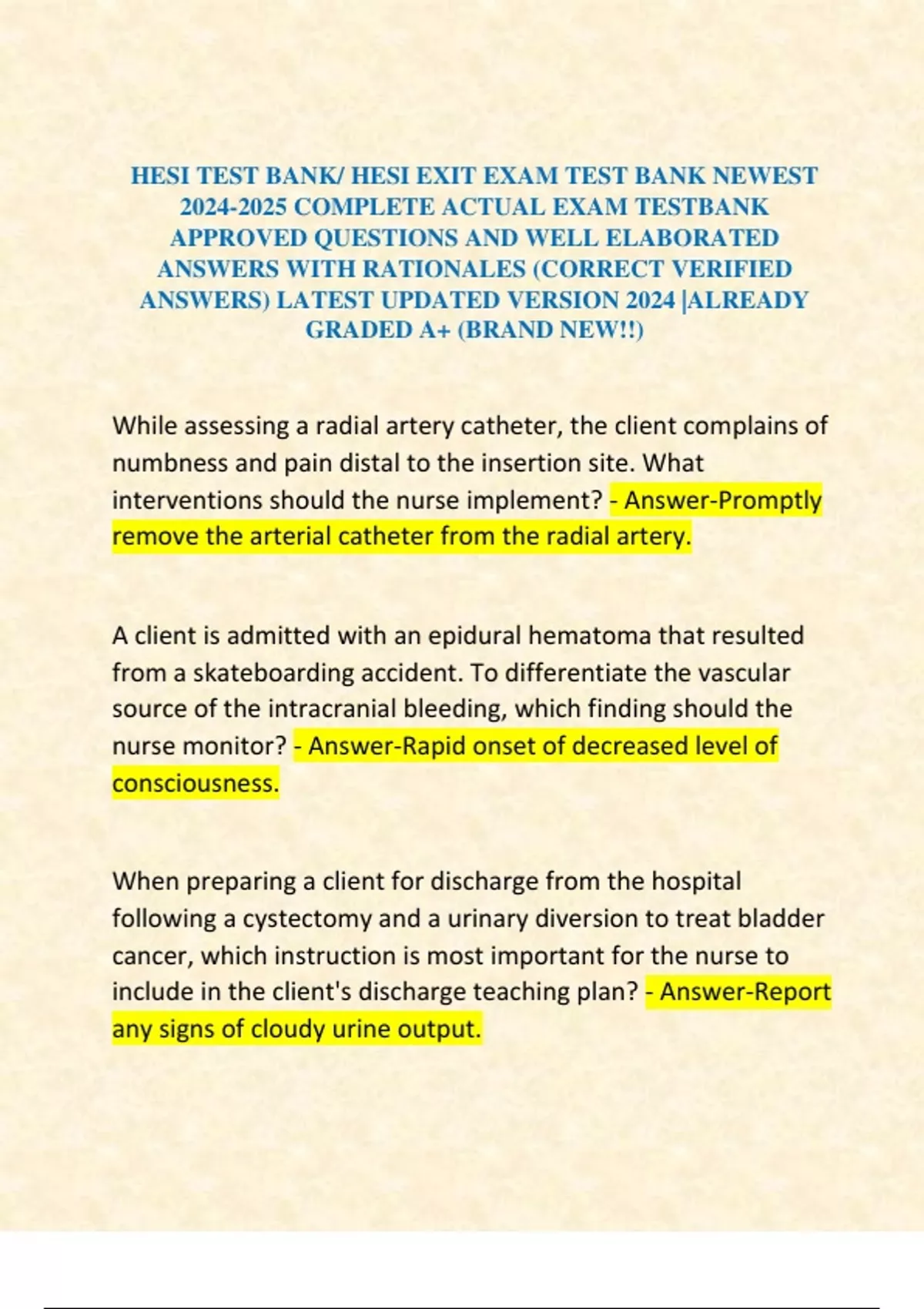 HESI TEST BANK/ HESI EXIT EXAM TEST BANK NEWEST COMPLETE ACTUAL EXAM TESTBANK APPROVED QUESTIONS AND WELL ELABORATED ANSWERS WITH RATIONALES (CORRECT VERIFIED ANSWERS) LATEST UPDATED VERSION 2024 |ALREADY GRADED A+ (BRAND NEW!!)