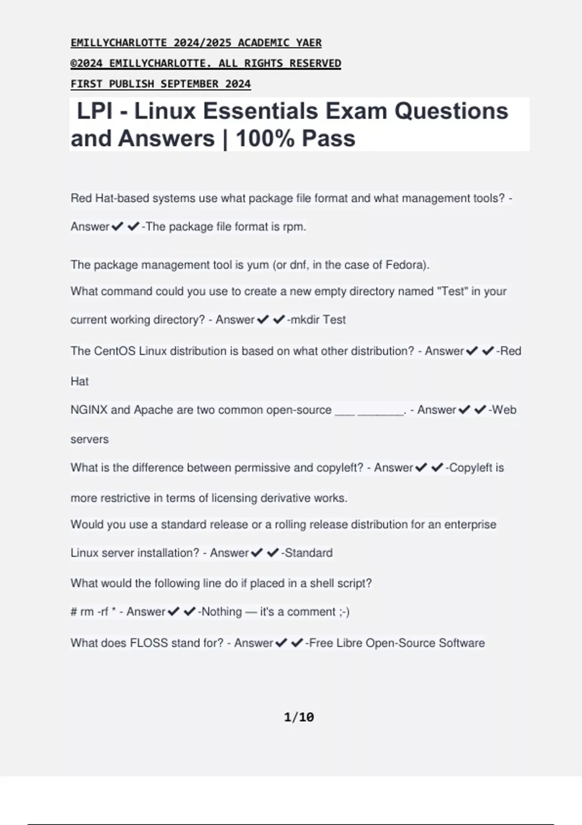 LPI - Linux Essentials Exam Questions and Answers | 100% Pass Red Hat-based systems use what package file format and what management tools? - Answer-The package file format is rpm. The package management tool is yum (or dnf, in the case of Fedora). What command could you use to create a new empty directory named "Test" in your current working directory? - Answer-mkdir Test The CentOS Linux distribution is based on what other distribution? - Answer-Red Hat NGINX and Apache are two common open-source ___ _______. - Answer-Web servers What is the difference between permissive and copyleft? - Answer-Copyleft is more restrictive in terms of licensing derivative works. Would you use a standard release or a rolling release distribution for an enterprise Linux server installation? - Answer-Standard What would the following line do if placed in a shell script? # rm -rf * - Answer-Nothing — it's a comment ;-) What does FLOSS stand for? - Answer-Free Libre Open-Source Software EMILLYCHARLOTTE 2024/2025 ACADEMIC YAER ©2024 EMILLYCHARLOTTE. ALL RIGHTS RESERVED FIRST PUBLISH SEPTEMBER 2024 2/10 What does 'cloud_user@ip-10-0-1-10 $' in the console mean? - Answer-The user cloud_user is logged into the host ip-10-0-1-10, and the shell is running with normal user privileges ($) and ready for commands. What command could you use to reference the documentation of a CLI utility? - Answer-man or info, followed by the utility name To what variable would you add the path to a shell script so you could execute it without referencing the path? - Answer-$PATH What source does a Linux distribution typically use for installations? - Answer-The distribution's software repository. Does the useradd command create the home directory by default? - Answer- useradd merely sets the home directory in /etc/passwd; it doesn't create it by default. What command could you use to display command history? - Answer-history What provides the basic utilities expected to exist on an operating system? - Answer-The GNU Core utilities What can dpkg-based systems use for package management? - Answer-apt What is the basic format of a for loop? - Answer-for VARIABLE in SOMETHING do COMMANDS done Which utility can be used to search for a pattern or string? - Answer-grep Which utility can be used to count the number of words in a file? - Answer-wc What is the basic format of an if statement? - Answer-if [ SOME_TEST ] EMILLYCHARLOTTE 2024/2025 ACADEMIC YAER ©2024 EMILLYCHARLOTTE. ALL RIGHTS RESERVED FIRST PUBLISH SEPTEMBER 2024 3/10 then SOME_COMMANDS fi How is Linux provisioned in the cloud? - Answer-Through the Linux images supplied by the cloud provider. What command would you use to open the info page for ls? - Answer-info ls What command would you use to see all of the contents (but not ownership, permissions, ., or ..) of /tmp? - Answer-ls -A /tmp How can a regular user elevate permissions for a particular command (if granted the ability in the /etc/sudoers file)? - Answer-sudo What do we call the collection of data centers that provide compute, application, and storage services over the internet? - Answer-The cloud! GPL is an example of what type of license? - Answer-Copyleft How could you hide the file "file" from being shown in a directory listing? - Answer-Change it to .file Which utilities can be used to print the contents of a file to the screen? - Answer- cat less more What method/protocol do we use to securely connect to a remote Linux server? - Answer-SSH (Secure Shell) EMILLYCHARLOTTE 2024/2025 ACADEMIC YAER ©2024 EMILLYCHARLOTTE. ALL RIGHTS RESERVED FIRST PUBLISH SEPTEMBER 2024 4/10 Would you use Samba or NFS to share files with Windows users? - Answer- Samba. (Samba is a file sharing service that uses CIFS for compatibility with Windows devices.) What command could you use to create a new empty file named "file1" in your current working directory? - Answer-touch file1 What happens to a symbolic link if the target file is moved or deleted? - Answer- Nothing; the link persists but the old destination is no longer reachable. What command(s) could you use to view all running processes? - Answer-ps aux ps -eF (lots of other options) What command could you use to create a new directory called "Test" in t