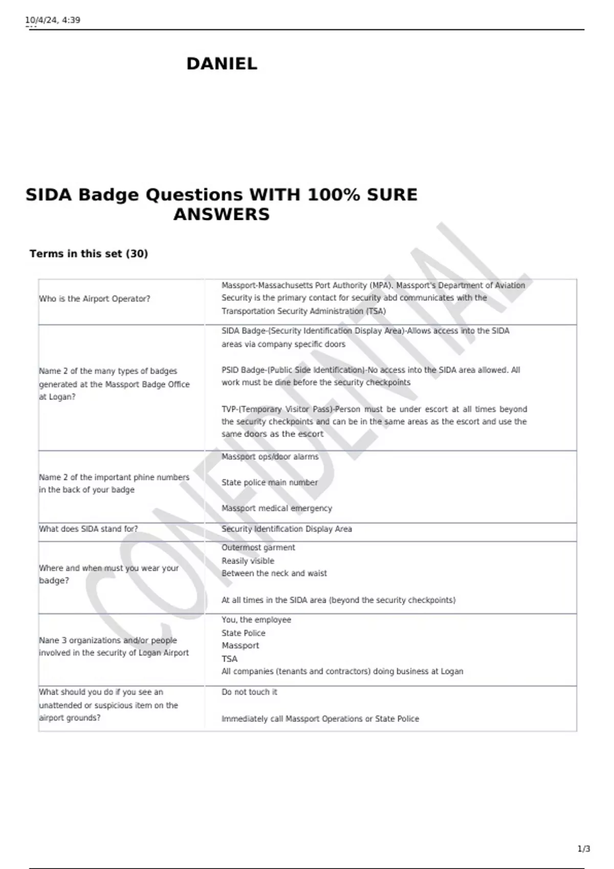 DANIEL SIDA Badge Questions WITH 100% SURE ANSWERS Terms in this set (30) Who is the Airport Operator? Massport-Massachusetts Port Authority (MPA). Massport's Department of Aviation Security is the primary contact for security abd communicates with the Transportation Security Administration (TSA) Name 2 of the many types of badges generated at the Massport Badge Office at Logan? SIDA Badge-(Security Identification Display Area)-Allows access into the SIDA areas via company specific doors PSID Badge-(Public Side Identification)-No access into the SIDA area allowed. All work must be dine before the security checkpoints TVP-(Temporary Visitor Pass)-Person must be under escort at all times beyond the security checkpoints and can be in the same areas as the escort and use the same doors as the escort Name 2 of the important phine numbers in the back of your badge Massport ops/door alarms State police main number Massport medical emergency What does SIDA stand for? Security Identification Display Area Where and when must you wear your badge? Outermost garment Reasily visible Between the neck and waist At all times in the SIDA area (beyond the security checkpoints) Nane 3 organizations and/or people involved in the security of Logan Airport You, the employee State Police Massport TSA All companies (tenants and contractors) doing business at Logan What should you do if you see an unattended or suspicious item on the airport grounds? Do not touch it Immediately call Massport Operations or State Police What is the Challenge Procedure? The process by which individuals with unescorted access contact, approach, or point out to appropriate authorities those individuals present in SIDA areas who are not displaying appropriate airport identification media Who is responsible for challenging individuals not showing a SIDA badge in the SIDA area? Every badge employee at Logan Who should you challenge in the SIDA area? Anyone not displaying a valid SIDA badge Anyone displaying a TVP and is without an escort Anyone exhibiting unusual behavior What is the first step to take when you approach a badge reader to gain access through a door? Place your badge directly in front of the badge reader What are your 2 main responsibilities when going through a secure door? To make sure you are the only person who enters theough the door Ensure the door closes securely behind you What is Piggybacking? When one individual enters their PIN code into a keypad, opens the door and allows others with a Massport SIDA badge to pass through How long can you hold a door open before the door will alarm? No more than 20 seconds What is your respondibility after putting a door in an over-ride mode? To stay at the door until the time runs out or until the door is securely closed and out of the over-ride mode What happens 5 minutes before the over- ride time runs out? A short alarm will sound warning you the time is running out What would you do if you walked by a door and the alarm was ringing? Call Massport Operations, Key Base Department (or have someone else call) Stand by the door until the State Police arrive What are the first 3 steps to take if you set off a door alarm in error? Securely close the door Stop the alarm by using your SIDA badge Call Massport Keybase from the door and get instructions from them What does TVP stand for? Temporary Visitor Pass Who must wear a TVP? Anyone doing business for an employer at Logan beyond the security checkpoint who does not possess a current Massport SIDA badge for that same employer When does an individual wearing a TVP need to remain with an escort? When in the SIDA area (beyond the security checkpoint) If your SIDA badge is lost or stolen or you leave it at home, can you apply for a TVP? No, you must find it, retrieve it, or not work in a SIDA area until you have a new badge If your badge is lost or stolen, what are your first 2 steps in getting a new badge? Notify your Badge Coordinator or the Badge Office immediatly to deactivate the badge Contact your Badge coordinator to begin the process for obtaining a new badge When leaving your current employer, when should you return your badge? To whom should you return your badge to aboid monetary fines? Return it immediatly Return it to your company's Badge Coordinator or the Massport Badge Office directly What does PSID stand for? Public Side Identification Can an employee with a PSID badge pass beyond the security checkpoints? No Can a SIDA badge holder escort a PSID badge holder into a secured area? No What does SAFE stand for in regards to the Massport SAFE program? Security Awareness for Everyone What is the SAFE program? See something, say something If you violate any rules of the airport, what are 2 of the possible consequences involved? You can be fined and/or Your company can be fined and/or Your badge could be revoked temporarily or permanently