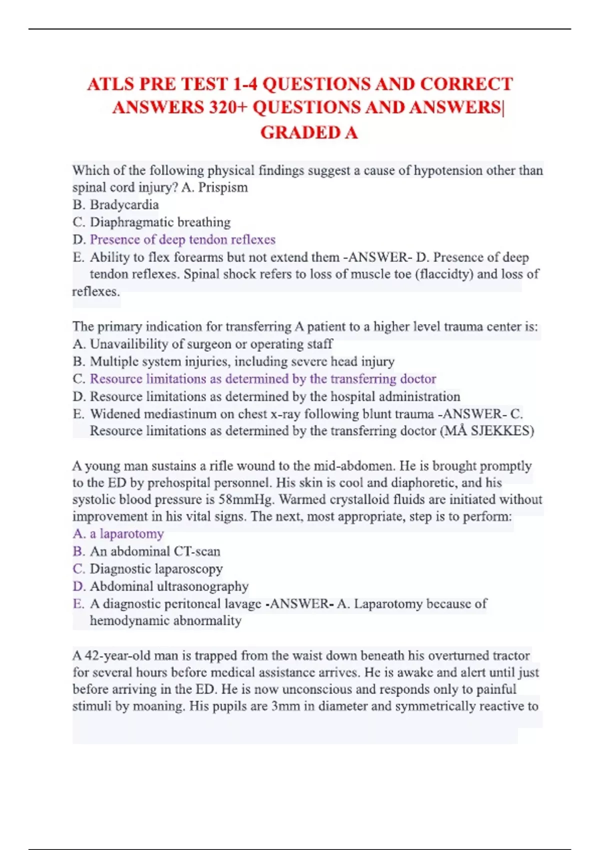 ATLS PRE TEST 1-4 QUESTIONS AND CORRECT ANSWERS 320+ QUESTIONS AND ANSWERS