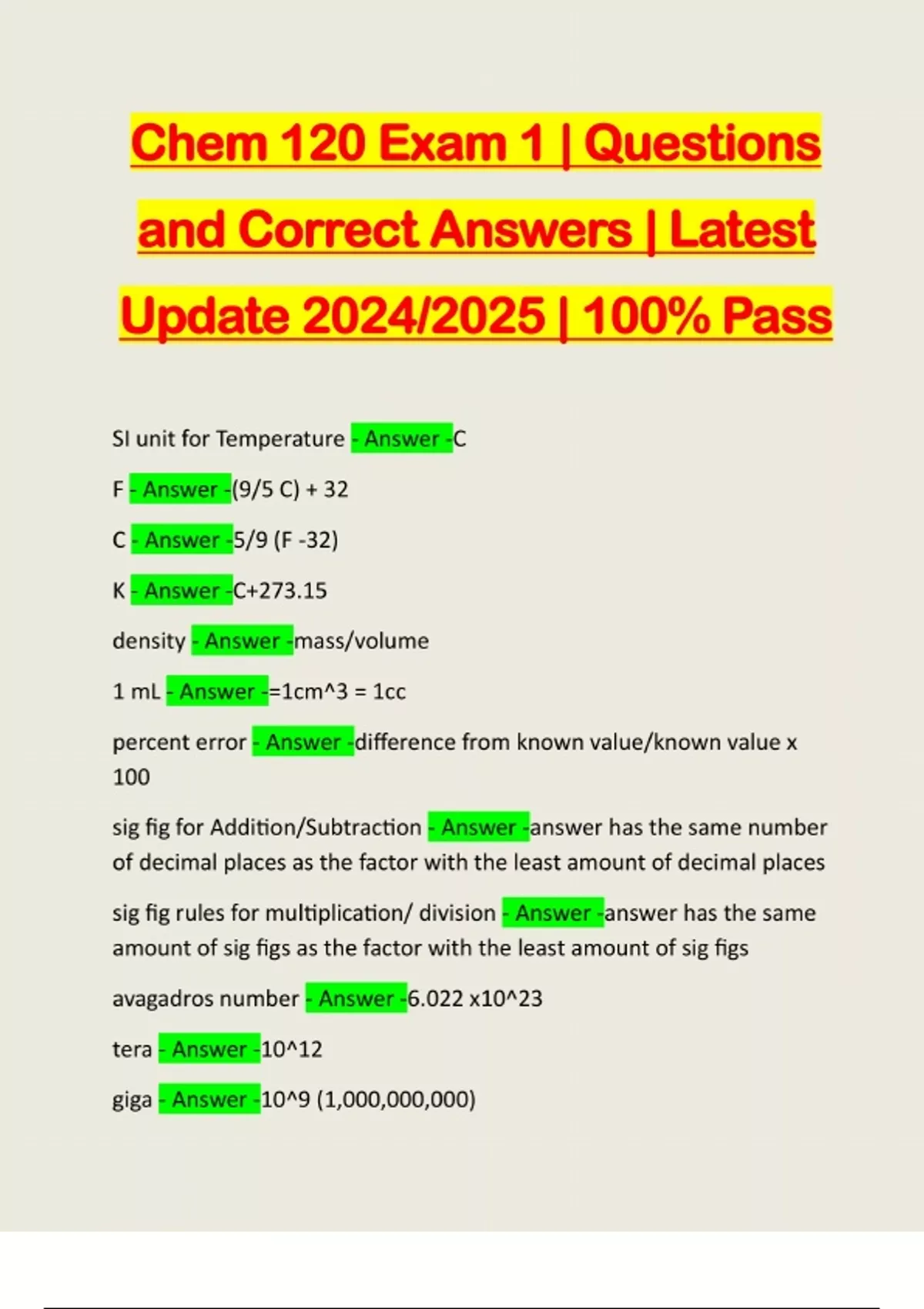Chem 120 Exam 1 | Questions and Correct Answers | Latest Update 2024/2025 | 100% Pass SI unit for Temperature - Answer -C F - Answer -(9/5 C) + 32 C - Answer -5/9 (F -32) K - Answer -C+273.15 density - Answer -mass/volume 1 mL - Answer -=1cm^3 = 1cc percent error - Answer -difference from known value/known value x 100 sig fig for Addition/Subtraction - Answer -answer has the same number of decimal places as the factor with the least amount of decimal places sig fig rules for multiplication/ division - Answer -answer has the same amount of sig figs as the factor with the least amount of sig figs avagadros number - Answer -6.022 x10^