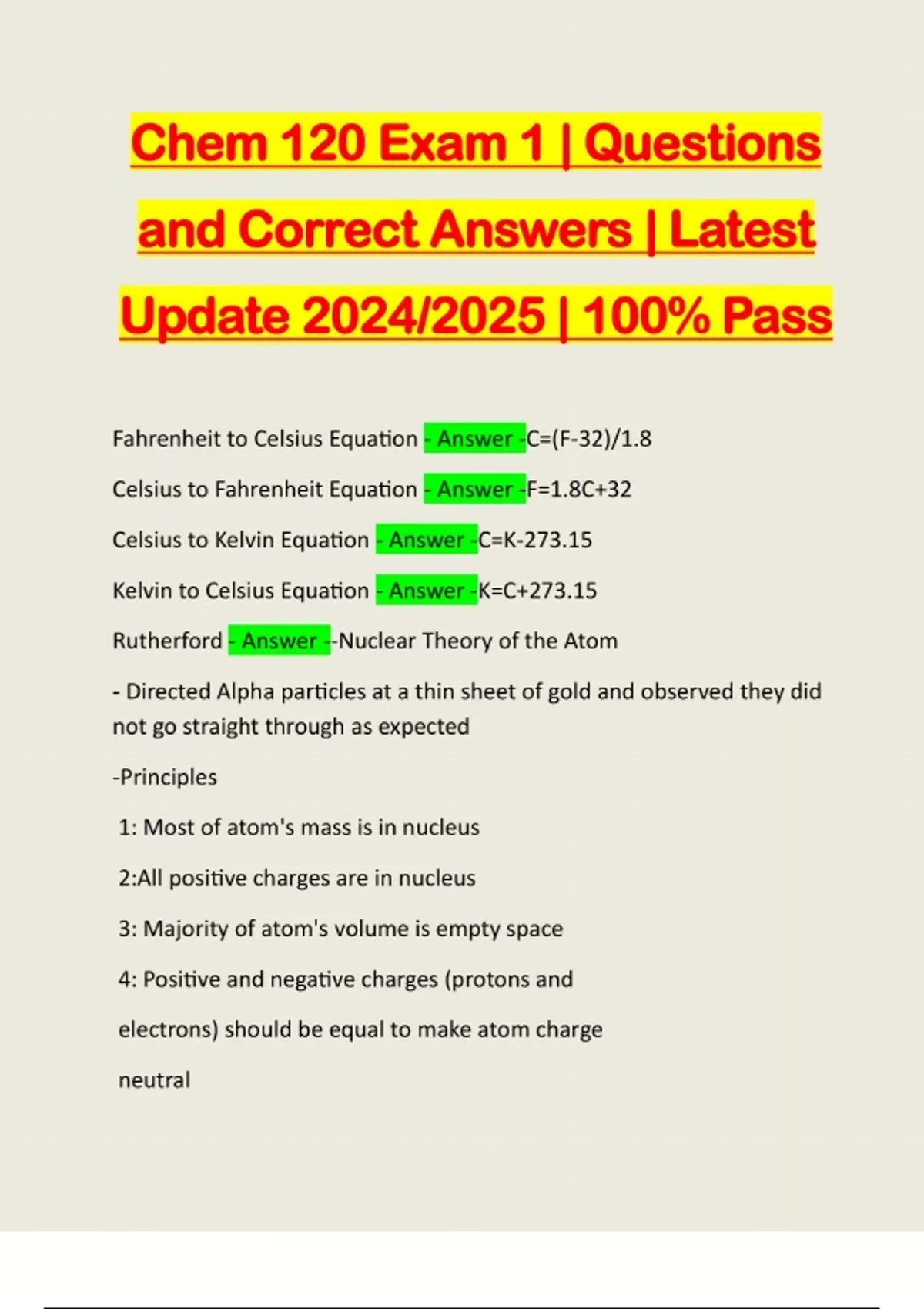 Chem 120 Exam 1 | Questions and Correct Answers | Latest Update 2024/2025 | 100% Pass Fahrenheit to Celsius Equation - Answer -C=(F-32)/1.8 Celsius to Fahrenheit Equation - Answer -F=1.8C+32 Celsius to Kelvin Equation - Answer -C=K-273.15 Kelvin to Celsius Equation - Answer -K=C+273.15 Rutherford - Answer --Nuclear Theory of the Atom - Directed Alpha particles at a thin sheet of gold and observed they did not go straight through as expected -Principles 1: Most of atom's mass is in nucleus 2:All positive charges are in nucleus 3: Majority of atom's volume is empty space 4: Positive and negative charges (protons and electrons) should be equal to make atom charge neutralCharge of Gold (Au) - Answer -Au+ Charge of Al - Answer -Al3+ Charge of Zn - Answer -Zn(2+)