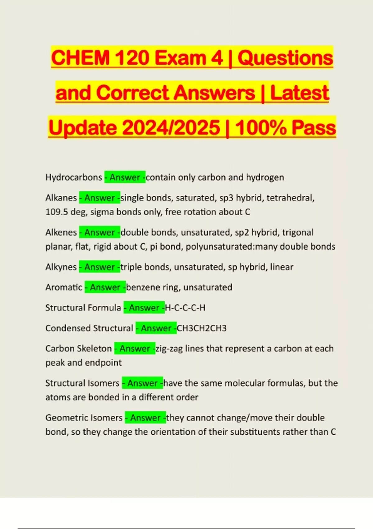 CHEM 120 Exam 4 | Questions and Correct Answers | Latest Update 2024/2025 | 100% Pass Hydrocarbons - Answer -contain only carbon and hydrogen Alkanes - Answer -single bonds, saturated, sp3 hybrid, tetrahedral, 109.5 deg, sigma bonds only, free rotation about C Alkenes - Answer -double bonds, unsaturated, sp2 hybrid, trigonal planar, flat, rigid about C, pi bond, polyunsaturated:many double bonds Alkynes - Answer -triple bonds, unsaturated, sp hybrid, linear Aromatic - Answer -benzene ring, unsaturated Structural Formula - Answer -H-C-C-C-H Condensed Structural - Answer -CH3CH2CH3 Carbon Skeleton - Answer -zig-zag lines that represent a carbon at each peak and endpoint Structural Isomers - Answer -have the same molecular formulas, but the atoms are bonded in a different order Geometric Isomers - Answer -they cannot change/move their doub