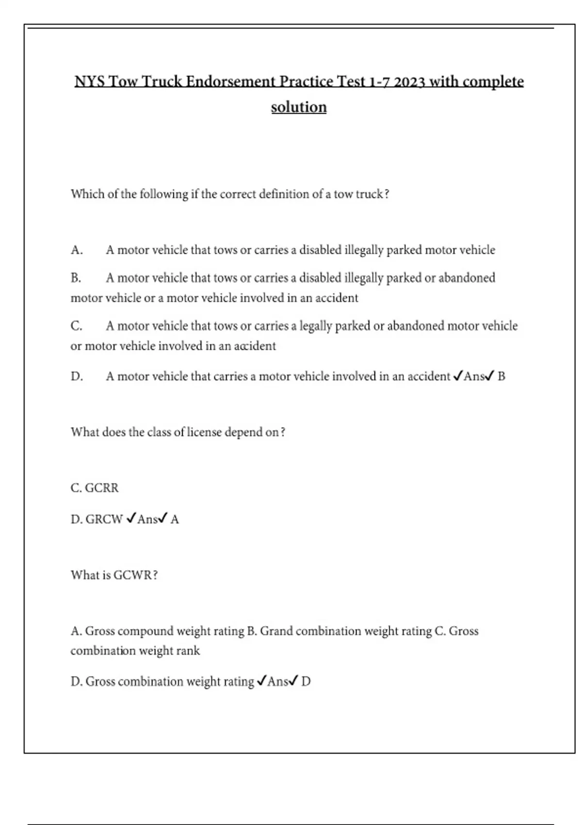 NYS Tow Truck Endorsement Practice Test 1-7 Spring 2024 with complete solution