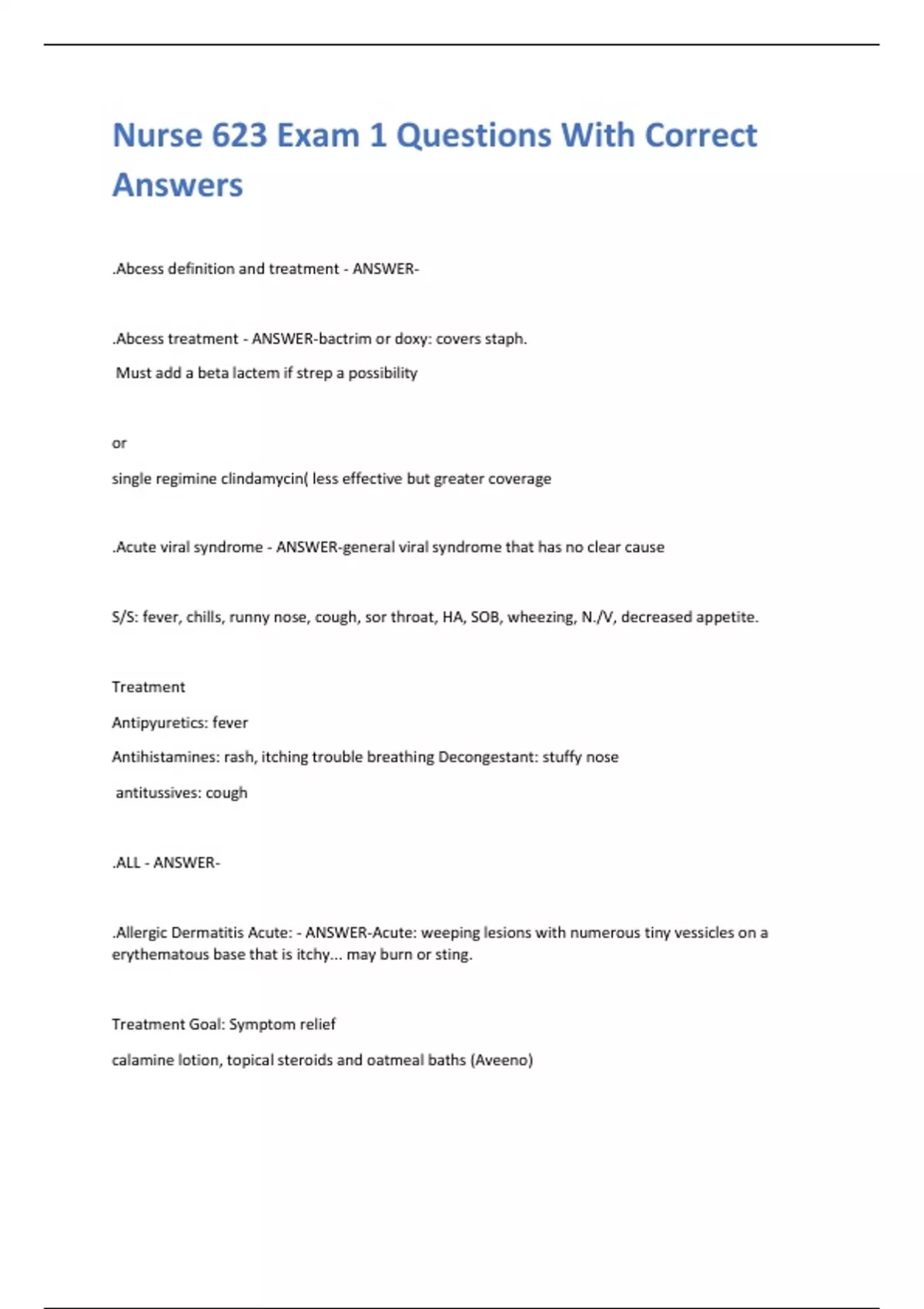 Nurse 623 Exam 1 Questions With Correct Answers .Abcess definition and treatment - ANSWER- .Abcess treatment - ANSWER-bactrim or doxy: covers staph. Must add a beta lactem if strep a possibility or single regimine clindamycin( less effective but greater coverage .Acute viral syndrome - ANSWER-general viral syndrome that has no clear cause S/S: fever, chills, runny nose, cough, sor throat, HA, SOB, wheezing, N./V, decreased appetite. Treatment Antipyuretics: fever Antihistamines: rash, itching trouble breathing Decongestant: stuffy nose antitussives: cough .ALL - ANSWER- .Allergic Dermatitis Acute: - ANSWER-Acute: weeping lesions with numerous tiny vessicles on a erythematous base that is itchy... may burn or sting