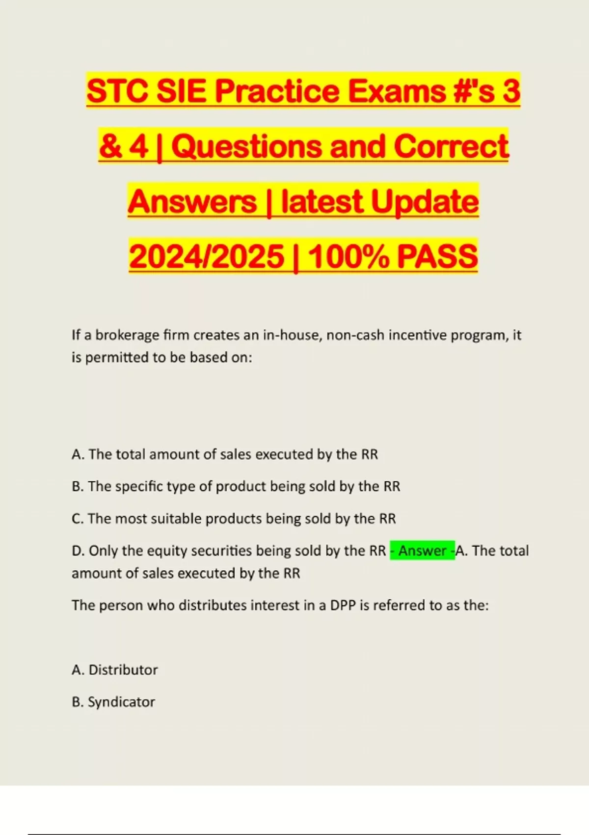 STC SIE Practice Exams #'s 3 & 4 | Questions and Correct Answers | latest Update 2024/2025 | 100% PASS If a brokerage firm creates an in-house, non-cash incentive program, it is permitted to be based on: A. The total amount of sales executed by the RR B. The specific type of product being sold by the RR C. The most suitable products being sold by the RR D. Only the equity securities being sold by the RR - Answer -A. The total amount of sales executed by the RR The person who distributes interest in a DPP is referred to as the: A. Distributor B. SyndicatorC. Managing partner D. Limited partner - Answer -B. Syndicator If an investor writes (sells) a covered call,