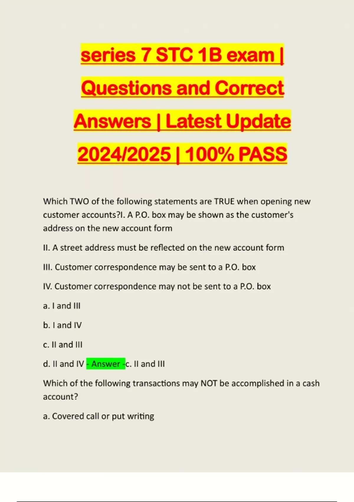 series 7 STC 1B exam | Questions and Correct Answers | Latest Update 2024/2025 | 100% PASS Which TWO of the following statements are TRUE when opening new customer accounts?I. A P.O. box may be shown as the customer's address on the new account form II. A street address must be reflected on the new account form III. Customer correspondence may be sent to a P.O. box IV. Customer correspondence may not be sent to a P.O. box a. I and III b. I and IV c. II and III d. II and IV - Answer -c. II and III Which of the following transactions may NOT be accomplished in a cash account? a. Covered call or put writingb. The sale of preferred stock c. Selling short d. The purchase of options - Answer -c. Selling short The Securities Investor Protection Corporation (SIPC) does not insure a: a. Margin account b. Joint account