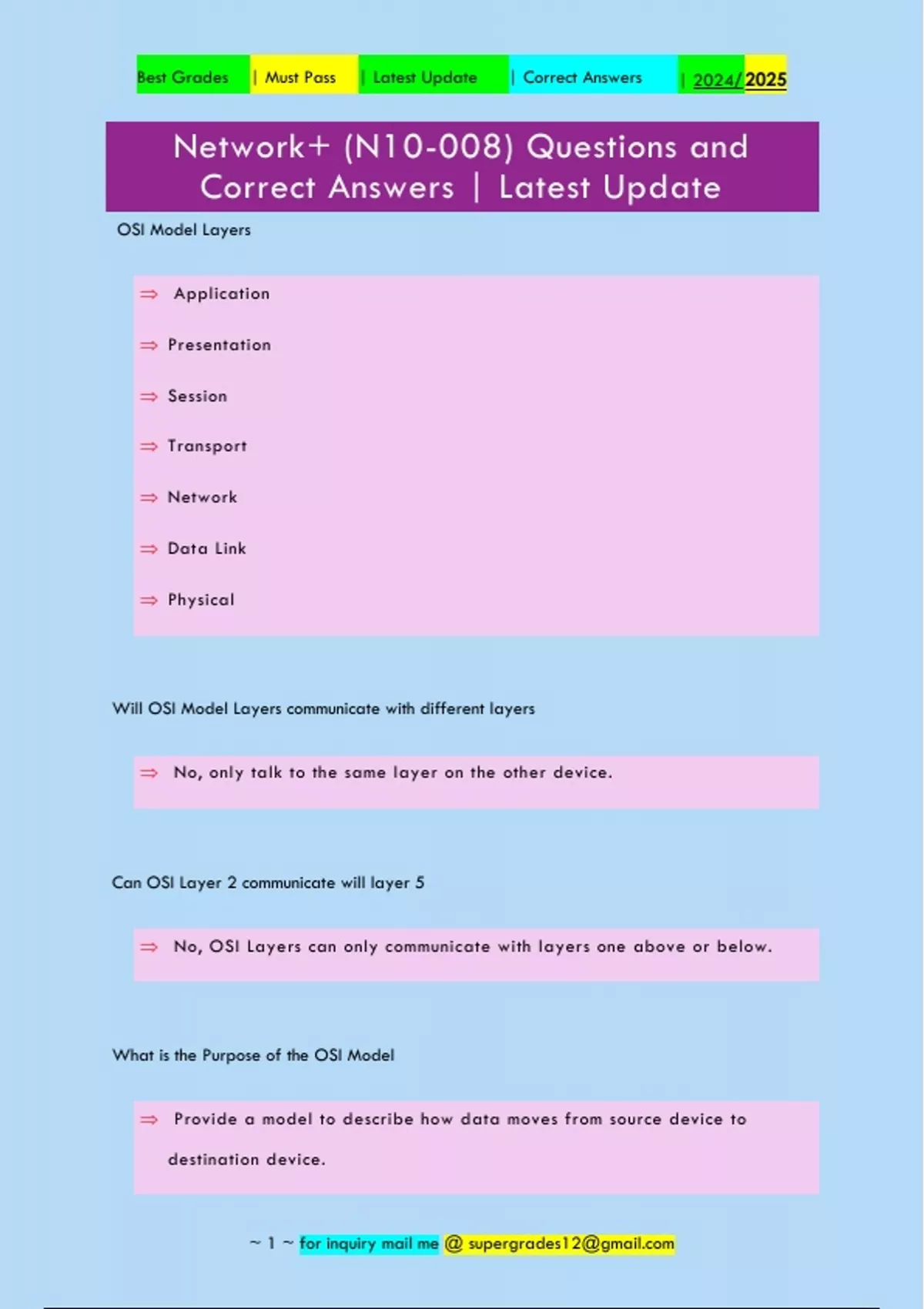 OSI Model Layers  Application  Presentation  Session  Transport  Network  Data Link  Physical Will OSI Model Layers communicate with different layers  No, only talk to the same layer on the other device. Can OSI Layer 2 communicate will layer 5  No, OSI Layers can only communicate with layers one above or below. What is the Purpose of the OSI Model  Provide a model to describe how data moves from source device to destination device. ~ 1 ~ for inquiry mail me @ Best Grades | Must Pass | Latest Update | Correct Answers | 2024/ 2025 What are the responsibilities of Layer 1 of the OSI Model  Transmission of bits over medium. What is the Physical medium that Layer 1 of the OSI model use to transmit data.  Cables, Connectors, NIC, Repeaters, and Hubs What is the Responsibilities of the Data Link Layer.  For Node to Node delivery & creates frames & Physical Address ( MAC Address). What does the Data Link Layer responsible to control  Access, Flow, and Error Describe Transmission Control's function  Establishing & Terminating, Media Access Management, Flow Control, Error Control, Access Control. What does the logical link control (LLC) sublayer of the data link layer determines? ~ 1 ~ for inquiry mail me @ Best Grades | Must Pass | Latest Update | Correct Answers | 2024/ 2025  To use either the connectionless or connection - oriented. What are the basic functions of th