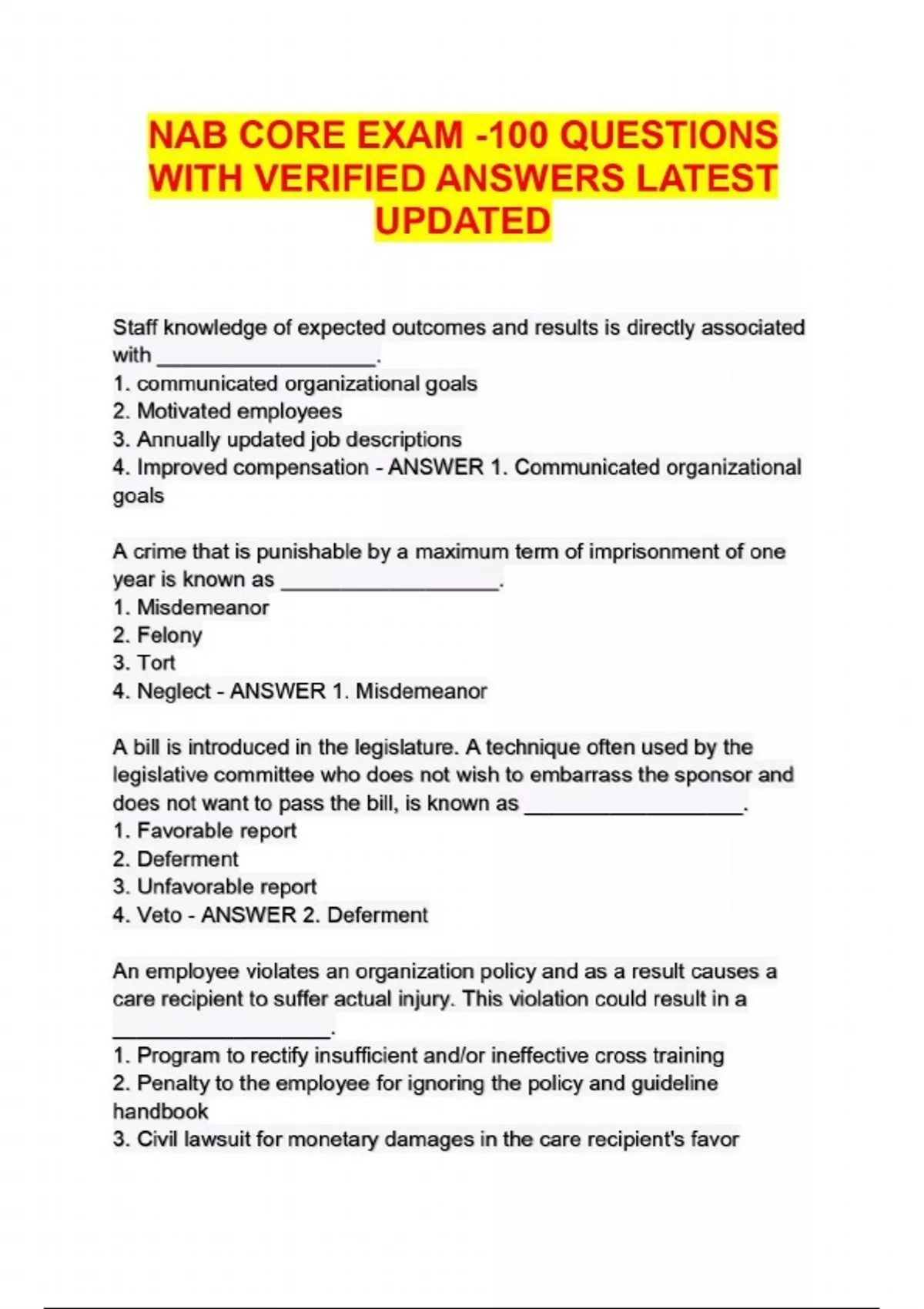 NAB CORE EXAM -100 QUESTIONS WITH VERIFIED ANSWERS LATEST UPDATED