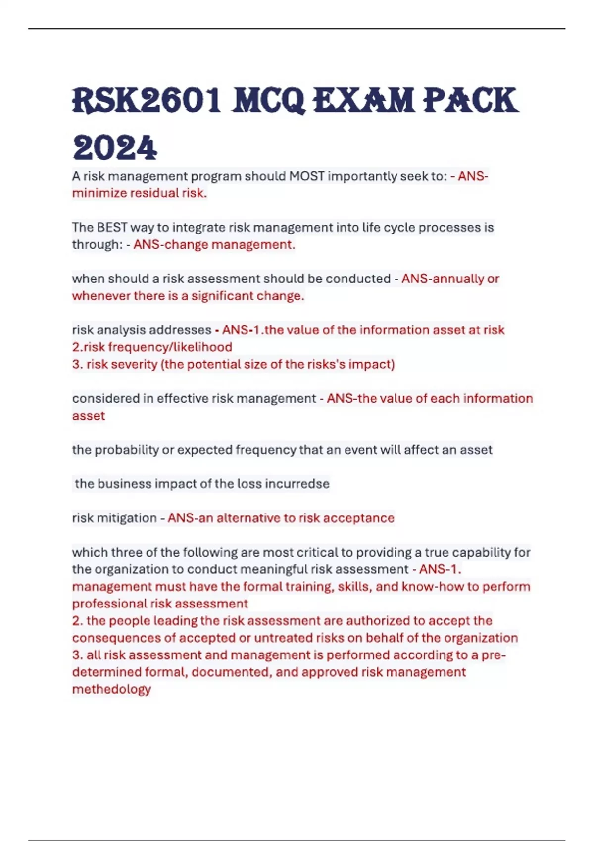 TEST BANK Enterprise Risk Management S - The Marketplace to Buy and Sell your Study Material 1 RSK2601 TEST BANK Question 1 Which one of the following is a benefit of effective risk and opportunity management? 1) Improved profit certainty 2) Increased shareholder value 3) Increased stakeholder confidence Correct option 3 4) Lower economic returns Explanation Improved cost certainty, sustainable shareholder value, increased stakeholder confidence and higher economic returns are all benefits of effective risk and opportunity management. Question 2 The board’s role should be to steer the corporation towards corporate governance policies that support … 1) long-term sustainable growth in shareholder value Correct option 1 2) short-term sustainable growth in shareholder value 3) short-term sustainable growth in stakeholder value 4) long-term sustainable growth in stakeholder value Explanation The board’s role should be to steer the corporation towards corporate governance policies that support long-term sustainable growth in shareholder value. Question 3 Which one of the following statements is not considered a benefit of Enterprise Risk Management (ERM)? 1) Minimise operational surprises and losses. 2) Enhance corporate governance. 3) Comply with relevant legal and regulatory requirements. 4) Align return appetite and strategy. Correct option 4 Explanation Benefits of Enterprise Risk Management (ERM) include minimisation of operational surprises and losses, enhancing corporate governance, complying with relevant legal and regulatory requirements and aligning risk appetite and strategy. The determination of the risk appetite of a business is vital in the ERM process because it shows how much risk the business is willing to take on. Question 4 The King II report moved away from the … bottom-line principle to a … bottom-line principle. 1) double - triple 2) single - triple Correct option 2 3) single - double 4) double – single 2 Explanation The King II report moved away from the single bottom-line principle to a triple bottom-line principle. Question 5 As of June 2010, companies listed on the JSE are expected to comply with … 1) King I 2) King II 3) King III Correct option 3 4) King IV Explanation As of June 2010, companies listed on the JSE are expected to comply with King III. Question 6 King III applies to … a) All listed companies on the JSE b) Banks c) Financial institutions d) Insurance institutions Choose the correct option. 1) a, b, c, d 2) a, b, c 3) a, b, d Correct option 3 4) a, b Explanation King III applies to all listed companies on the JSE, banks, financial and insurance institutions. Question 7 In financial ratio analysis, efficiency ratios … 1) measures the degree of success of the management in achieving their primary purpose of creating wealth for their owners 2) are also known as activity ratios correct option 2 3) examine the relationship between liquid resources held and creditors due for payment in the near future 4) assess the returns and performance of shares held in a particular business Explanation In financial ratio analysis, efficiency ratios are also known as activity ratios. Question 8 A GAP analysis … 1) is used to list all the risks that were identified on previous projects within the business 2) is a list that categorises each risk into a type of area 3) can be used to identify the main risks linked to a certain activity or project of the business Correct option 3 S - The Marketplace to Buy and Sell your Study Material 3 4) is a structured checklist to breakdown the risks and opportunities into manageable components Explanation A GAP analysis can be used to identify the main risks linked to a certain activity or project of the business. A risk checklist is used to list all the risks that were identified on previous projects within the business. A risk prompt list is a list that categorises each risk into a type or area. Risk taxonomy is a structured checklist to breakdown the risks and opportunities into manageable components. Question 9 Pareto analysis is used to … 1) identify those risks that will have a dramatic impact on business projects/activities and objectives Correct option 1 2) determine the expected return of an asset in relation to its risk or risk profile 3) structure decisions, uncertain events and values of outcomes 4) identify the causes of any risk Explanation Pareto analysis is used to identify those risks that will have a dramatic impact on business projects/activities and objectives. The CAPM model is used to determine the expected return of an asset in relation to its risk or risk profile. Decision analysis is used to structure decisions, uncertain events and values of outcomes. Casual analysis is used to identify the causes of any risk. Question 10 The attitude towards risk that requires an increase in the return for an increase in the risk is known as risk … 1) neutral 2) seeking 3) averse Correct option 3 4) impartial Explanation The attitude towards risk that requires an increase in the return for an increase in the risk is known as risk averse. Question 11 The … is a method used by a business to evaluate the effect of uncertainty on a planned activity in a range of situations and uses random numbers to sample from a probability distribution. 1) scenario analysis 2) simulation 3) Monte Carlo Simulation Correct option 3 4) latin hypercube sampling Explanation The Monte Carlo simulation is a method used by a business to evaluate the effect of uncertainty on a planned activity in a range of situations and uses random numbers to sample from a probability distribution. S - The Marketplace to Buy and Sell your Study Material Downloaded by: LIBRARY | Distribution of this document is illegal Want to earn $103 per month? S - The Marketplace to Buy and Sell your Study Material 4 Question 12 The … is used to re-create the probability distributions specified by distribution functions accurately. 1) scenario analysis 2) si