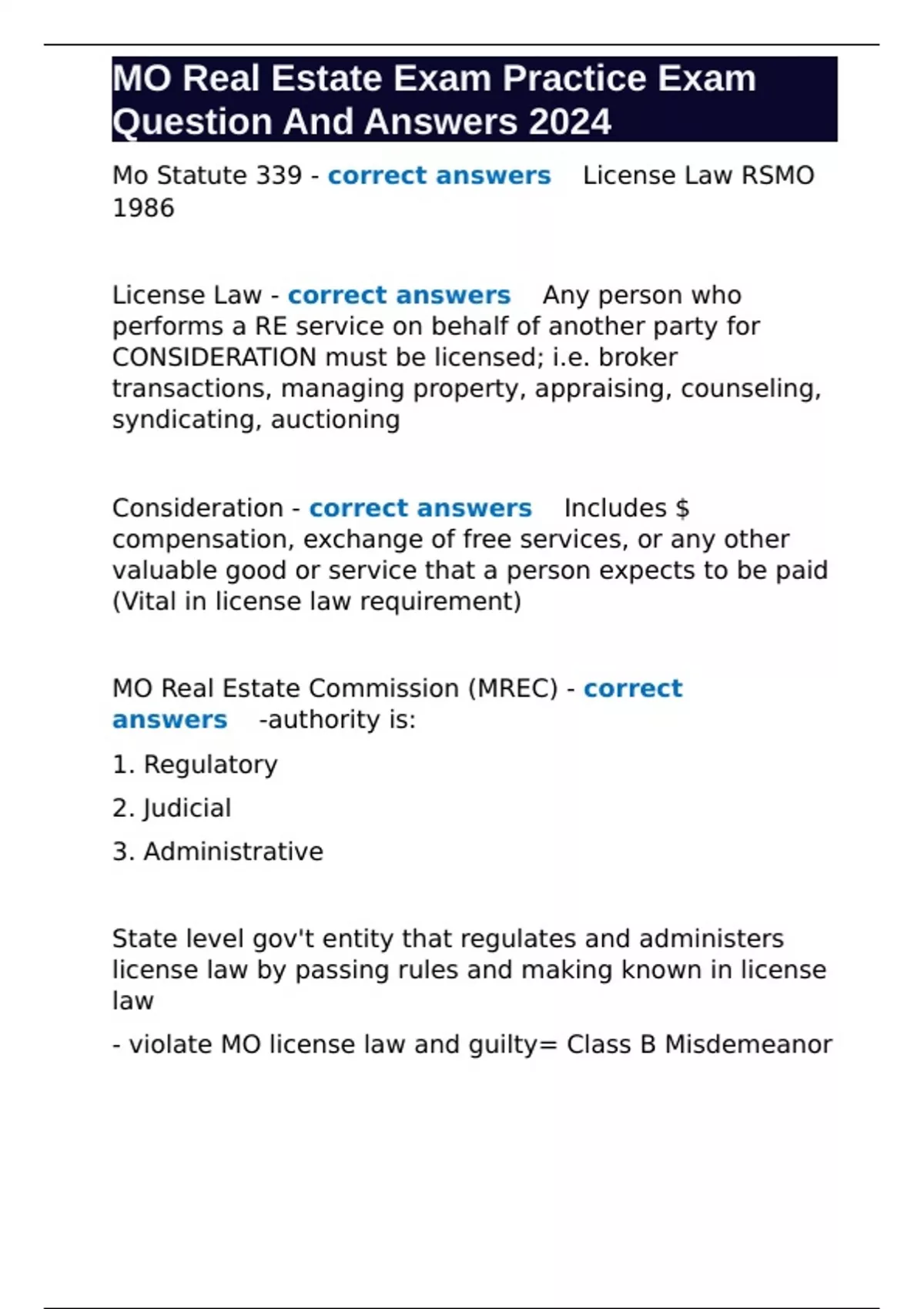 MO Real Estate Exam Practice Exam Question And Answers 2024