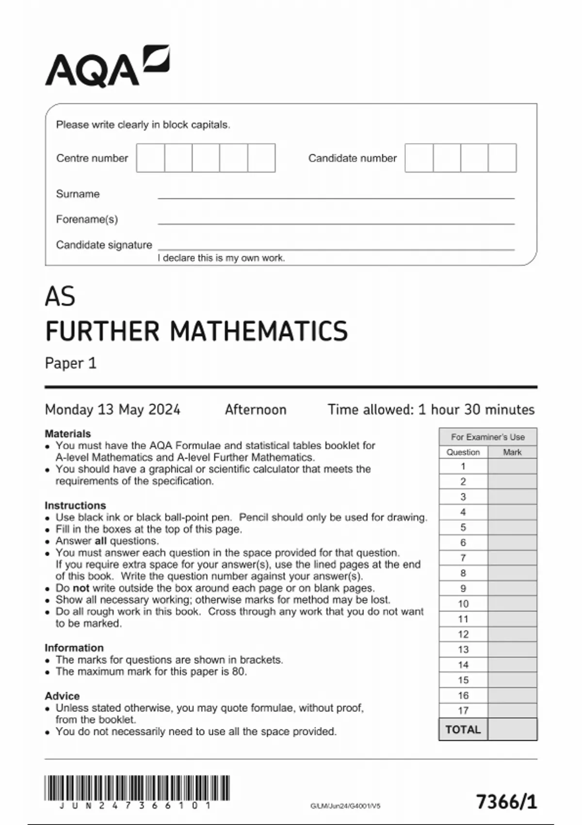 AQA AS FURTHER MATHEMATICS QUESTION PAPER 1 2024 (7366/1)
