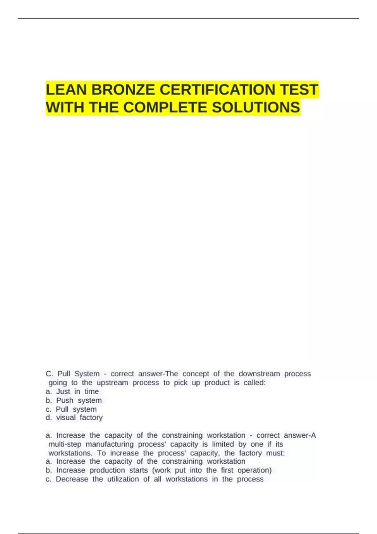 LEAN BRONZE CERTIFICATION TEST WITH THE COMPLETE SOLUTIONS.