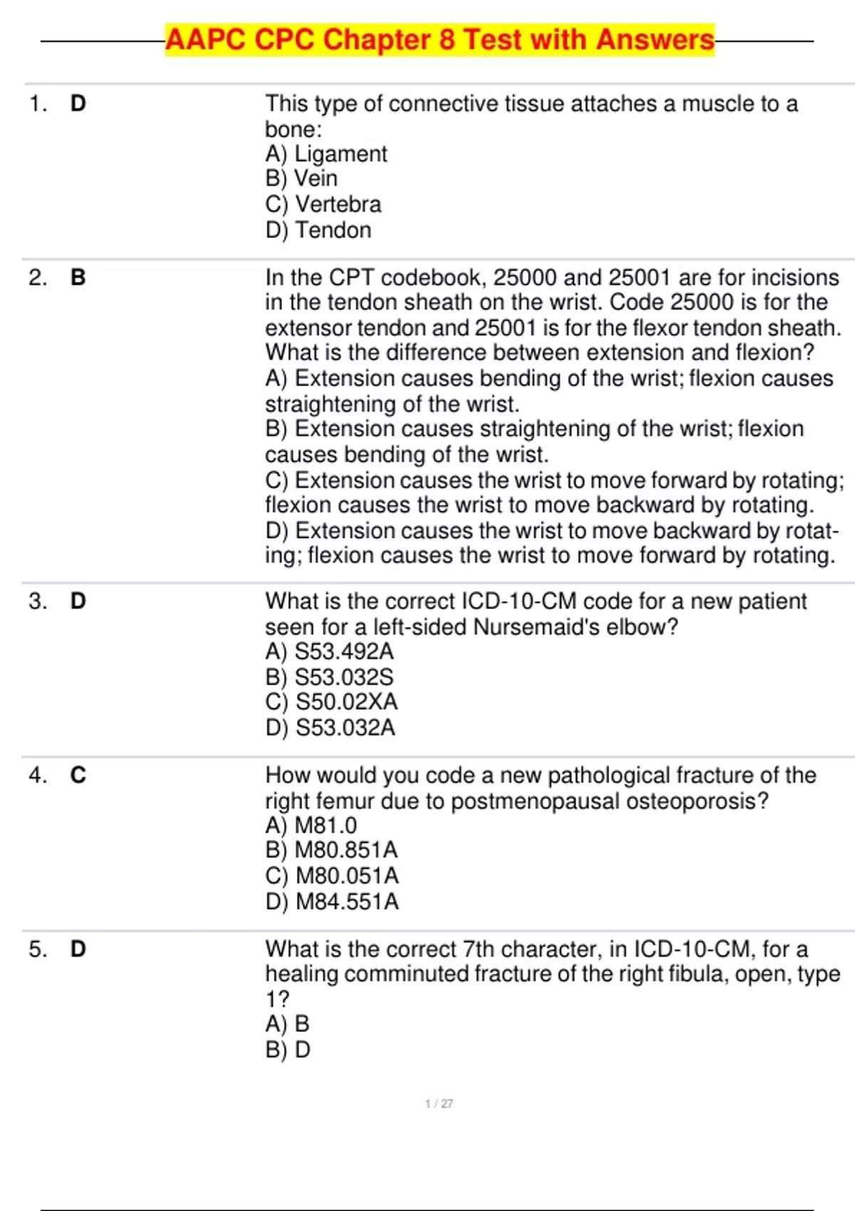 AAPC CPC Chapter 8 Test with Answers 1. D This type of connective tissue attaches a muscle to a bone: A) Ligament B) Vein C) Vertebra D) Tendon 2. B In the CPT codebook, 25000 and 25001 are for incisions in the tendon sheath on the wrist. Code 25000 is for the extensor tendon and 25001 is for the flexor tendon sheath. What is the difference between extension and flexion? A) Extension causes ben