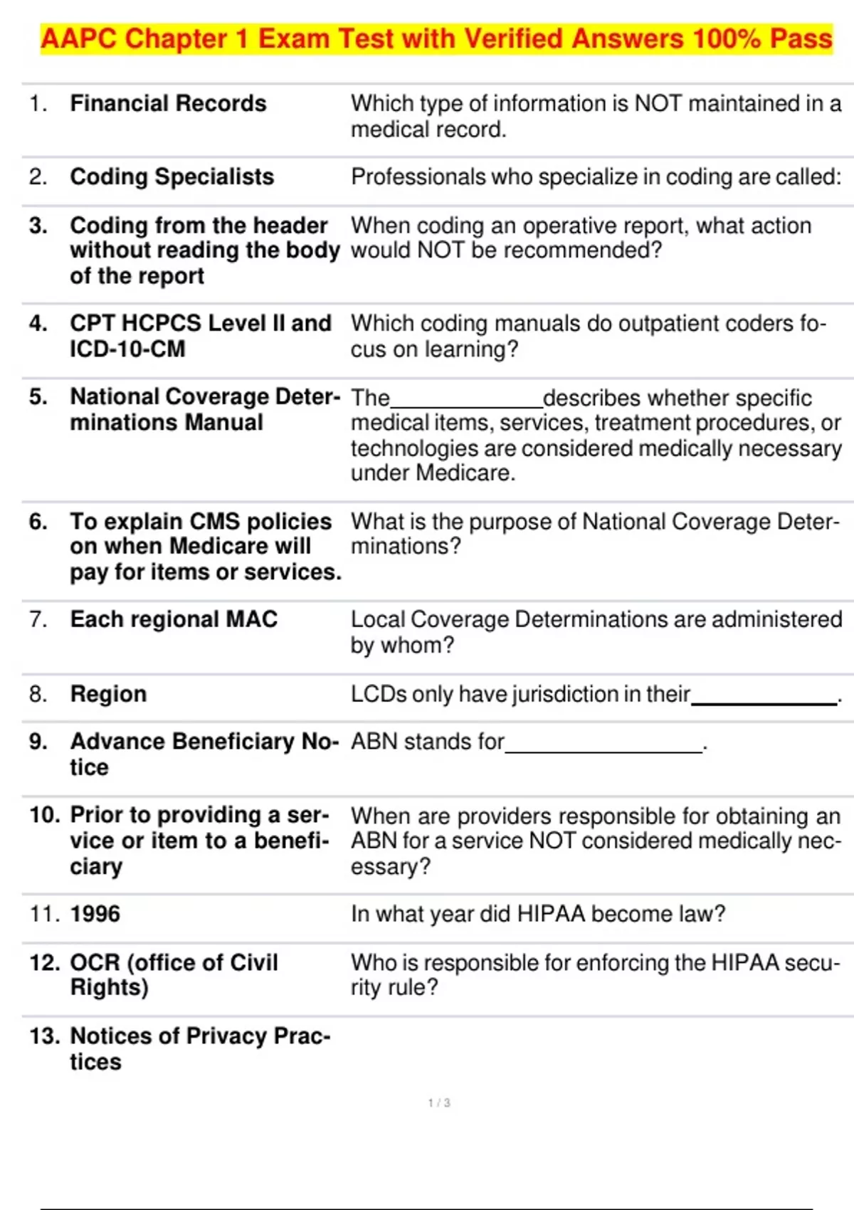 AAPC Chapter 1 Exam Test with Verified Answers 100% Pass 1. Financial Records Which type of information is NOT maintained in a medical record. 2. Coding Specialists Professionals who specialize in coding are called: 3. Coding from the header without reading the body of the report 4. CPT HCPCS Level II and ICD-10-CM 5. National Coverage Deter- minations Manual 6. To explain CMS policies on when Medicare will pay for items or services. When coding an operative report, what action would NOT be recommended? Which coding manuals do outpatient coders fo- cus on learn