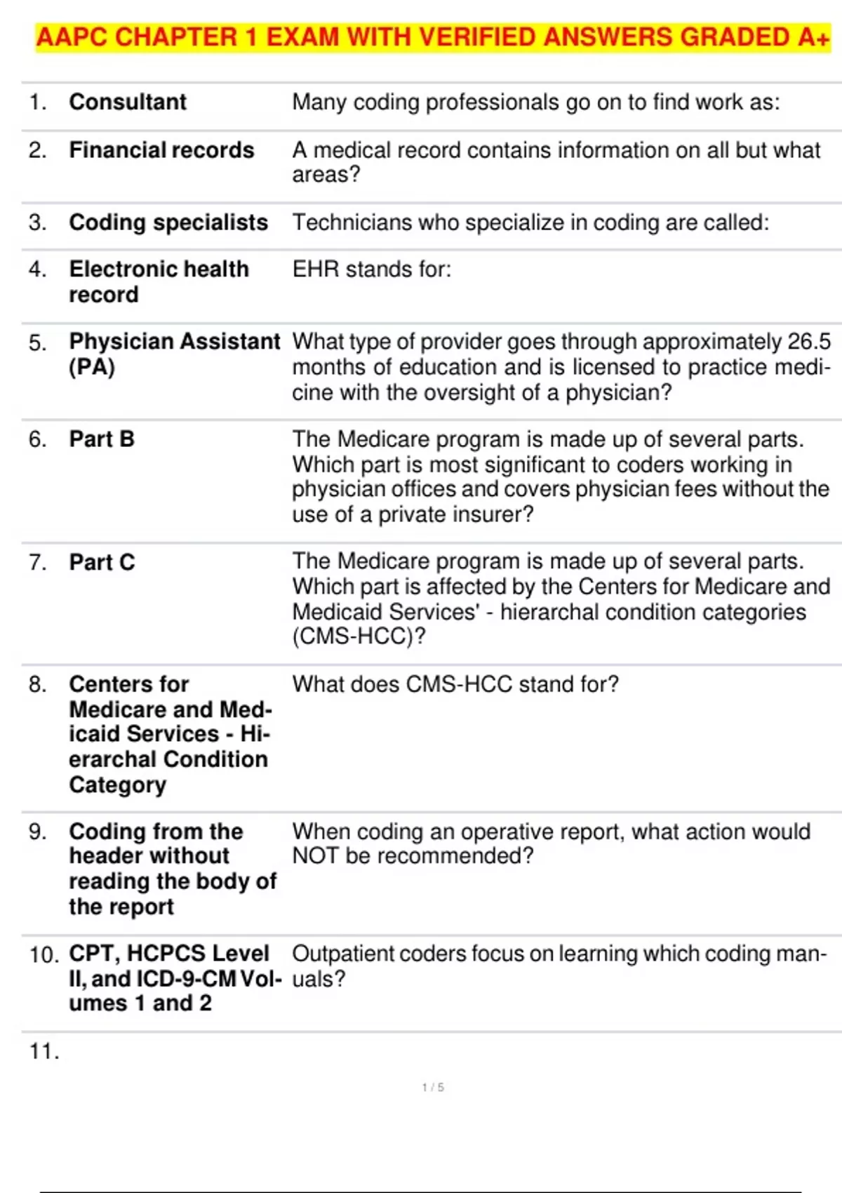 AAPC CHAPTER 1 EXAM WITH VERIFIED ANSWERS GRADED A+ Consultant Financial records Coding specialists Electronic health record Physician Assistant (PA) Part B Part C Centers for Medicare and Med- icaid Services - Hi- erarchal Condition Category Coding from the header without reading the body of the report CPT, HCPCS Level II, and ICD-9-CM Vol- umes 1 and 2 Many coding professionals go on to find work as: A medical record contains information on all but what areas? Technicians who specialize in coding are called: EHR