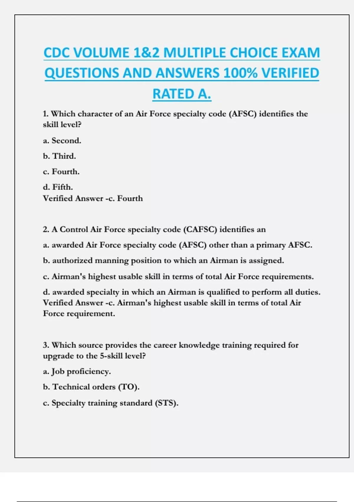 CDC VOLUME 1&2 MULTIPLE CHOICE EXAM QUESTIONS AND ANSWERS 100% VERIFIED RATED A.