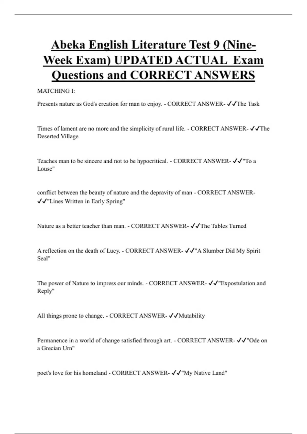 Presents nature as God's creation for man to enjoy. - CORRECT ANSWER- ✔✔The Task