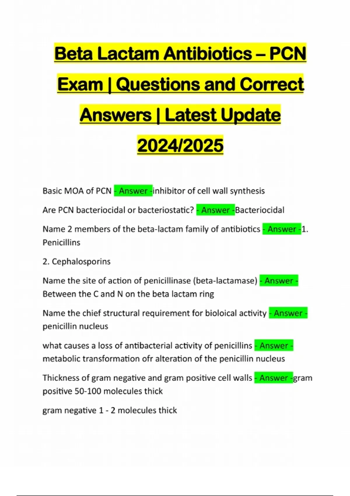 Beta Lactam Antibiotics – PCN Exam | Questions and Correct Answers | Latest Update 2024/2025 Basic MOA of PCN - Answer -inhibitor of cell wall synthesis Are PCN bacteriocidal or bacteriostatic? - Answer -Bacteriocidal Name 2 members of the beta-lactam family of antibiotics - Answer -1. Penicillins 2. Cephalosporins Name the site of action of penicillinase (beta-lactamase) - Answer - Between the C and N on the beta lactam ring Name the chief structural requirement for bioloical activity - Answer - penicillin nucleus what causes a loss of antibacteria