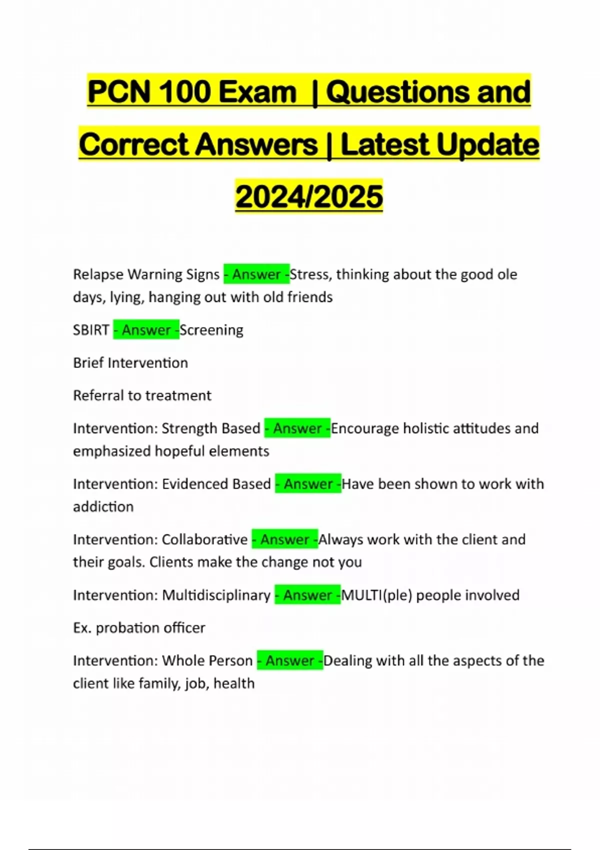 PCN 100 Exam | Questions and Correct Answers | Latest Update 2024/2025 Relapse Warning Signs - Answer -Stress, thinking about the good ole days, lying, hanging out with old friends SBIRT - Answer -Screening Brief Intervention Referral to treatment Intervention: Strength Based - Answer -Encourage holistic attitudes and emphasized hopeful elements Intervention: Evidenced Based - Answer -Have been shown to work with addiction