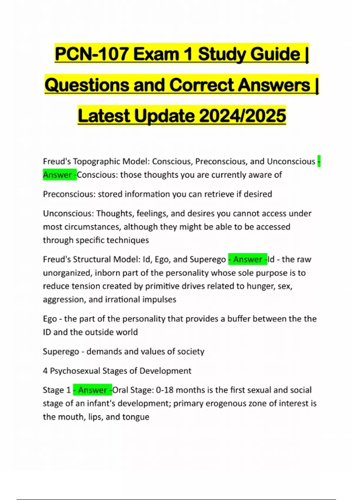 PCN-107 Exam 1 Study Guide | Questions and Correct Answers | Latest Update 2024/2025 Freud's Topographic Model: Conscious, Preconscious, and Unconscious - Answer -Conscious: those thoughts you are currently aware of Preconscious: stored information you can retrieve if desired Unconscious: Thoughts, feelings, and desires you cannot access under most circumstances, although they might be able to be accessed through specific techniques Freud's Structural Model: Id, Ego, and Superego - Answer -Id - the raw unorganized, inborn part of the personality whose sole purpose is to reduce tension created by primitive drives related to hunger, sex, aggression, and irrational impulses Ego - the part of the personality that provides a buffer between the the ID and the outside world Superego - demands and values of soc