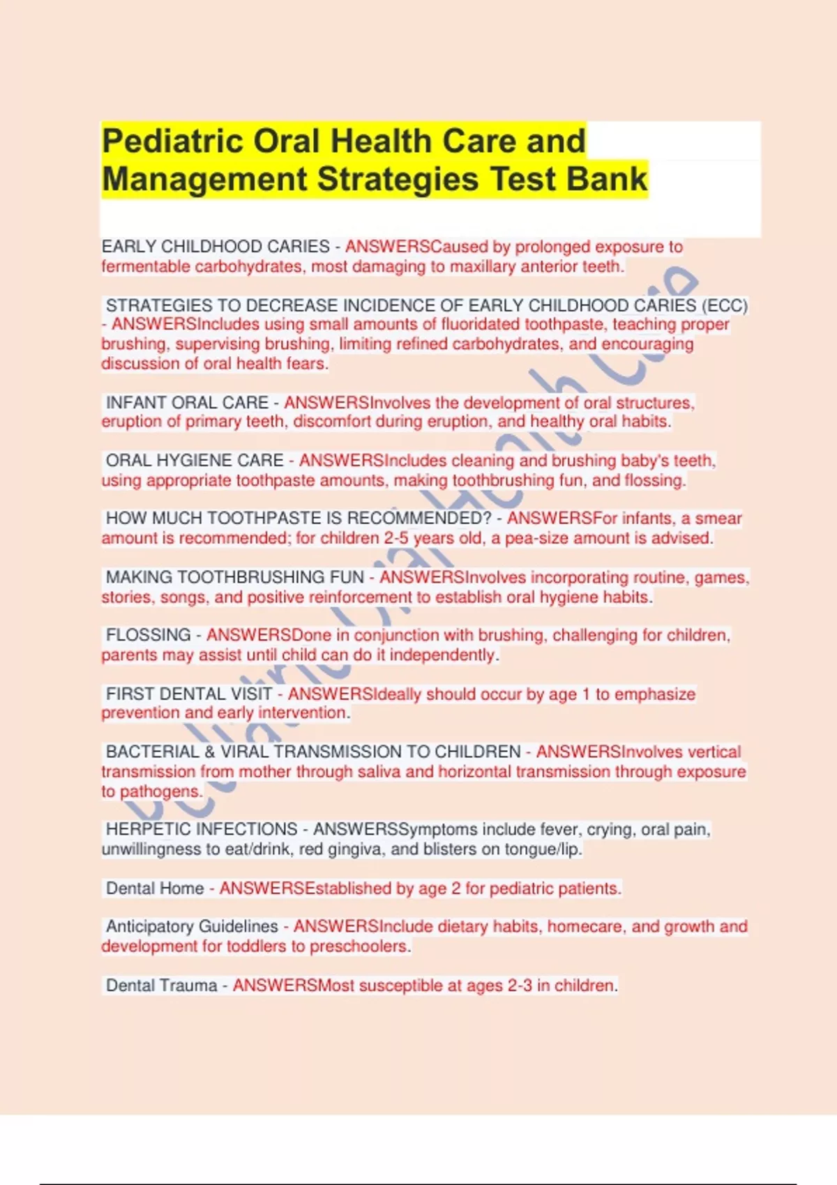 Pediatric Oral Health Care and Management Strategies Test Bank