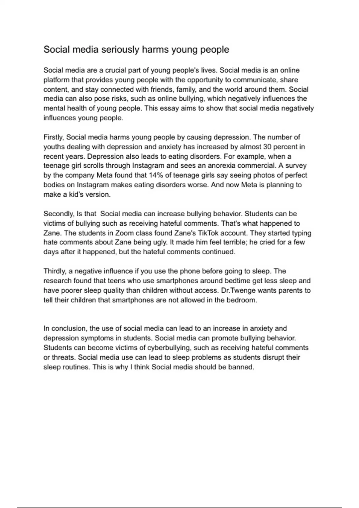 Het is een engels essay over social media harms young people. Het is een goede essay waardoor je idee krijgt hoe je uperhaupt een engels essay kan schrijven. (zelf geschreven)