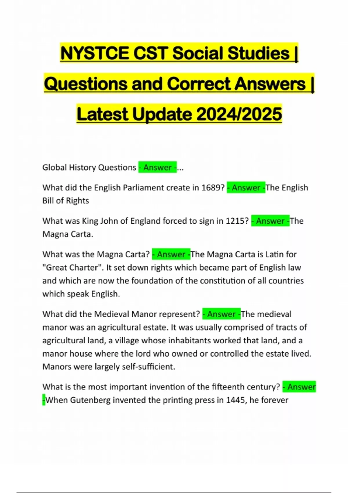 NYSTCE CST Social Studies | Questions and Correct Answers | Latest Update 2024/2025 Global History Questions - Answer -... What did the English Parliament create in 1689? - Answer -The English Bill of Rights What was King John of England forced to sign in 1215? - Answer -The Magna Carta. What was the Magna Carta? - Answer -The Magna Carta is Latin for "Great Charter". It set down rights which became part of English law and which are now the foundation of the constitution of all countries which speak English. What did the Medieval Manor represent? - Answer -The medieval manor was an agricultural estate. It was usually comprised of tracts of agricultural land, a village whose inhabitants worked that land, and a manor house where the lord who owned or controlled the estate lived. Manors were largely self-sufficient. What is the most important invention of the fifteenth century? - Answer -When Gutenberg invented the printing press in 1445, he foreverchanged the lives of people in Europe and, eventually, all over the world. Which of the following was the most freq
