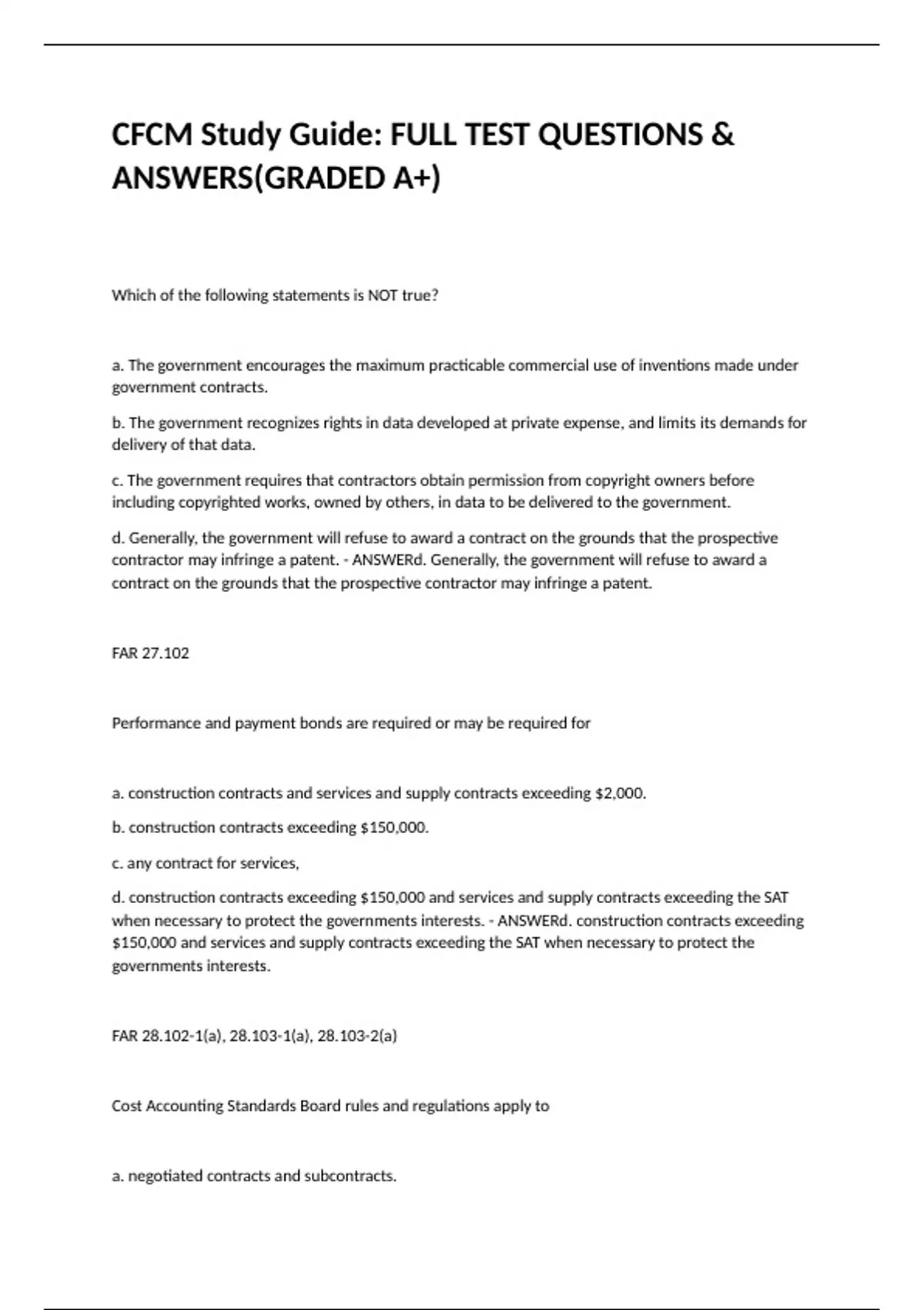Which of the following statements is NOT true? a. The government encourages the maximum practicable commercial use of inventions made under government contracts. b. The government recognizes rights in data developed at private expense, and limits its demands for delivery of that data. c. The government requires that contractors obtain permission from copyright owners before including copyrighted works, owned by others, in data to be delivered to the government. d. Generally, the government will refuse to award a contract on the grounds that the prospective contractor may infringe a patent. - ANSWERd. Generally, the government will refuse to award a contract on the grounds that the prospective contractor may infringe a patent. FAR 27.102 Performance and payment bonds are required or may be required for a. construction contracts and services and supply contracts exceeding $2,000. b. construction contracts exceeding $150,000. c. any contract for services, d. construction contracts exceeding $150,000 and services and supply contracts exceeding the SAT when necessary to protect the governments interests. - ANSWERd. construction contracts exceeding $150,000 and services and supply contracts exceeding the SAT when necessary to protect the governments interests. FAR 28.102-1(a), 28.103-1(a), 28.103-2(a) Cost Accounting Standards Board rules and regulations apply to a. negotiated contracts and subcontracts. b. sealed bid contracts. c. contracts with small business concerns. d. bridge contracts. - ANSWERa. negotiated contracts and subcontracts. FAR 30.201-5 Which of the following statements about advance agreements is NOT true? a. Advance agreements may only be negotiated with a particular contractor for a single contract. b. Advance agreements may be negotiated either before or during a contract. c. The agreement must be in writing. d. The agreements must be incorporated into applicable current and future contracts. - ANSWERa. Advance agreements may only be negotiated with a particular contractor for a single contract. FAR 31.109 A cost is reasonable if, in its nature and amount, it does not exceed that which would be a. incurred by a prudent person in the conduct of competitive business. b. accrued by a prudent person in the conduct of competitive business. c. determined to be allowable by the CO. d. determined to be allocable by the CO. - ANSWERa. incurred by a prudent person in the conduct of competitive business. FAR 31.201-3 What definition best describes alternative dispute resolution? a. Procedures used to resolve issues in controversy. b. Procedures voluntarily used to resolve issues in controversy. c. Procedures used for asserting and resolving claims. d. Procedures voluntarily used for asserting and resolving claims. - ANSWERb. Procedures voluntarily used to resolve issues in controversy. FAR 33.214 The government's policy is to try to resolve all contractual issues in controversy by a. mutual agreement at the CO's level. b. bilateral agreement at the CO's level. c. mutual agreement at a level above the CO. d. unilateral agreement at the CO's level. - ANSWERa. mutual agreement at the CO's level. FAR 33.204 After receiving the GAO's written notice that a protest has been filed, an agency must give notice a. of the protest to the contractor or all parties who appear to have a reasonable prospect of receiving an award. b. of the protest only to the prime contractor performing the work. c. of the protest to all parties who appear to have a reasonable prospect of receiving award and begin compiling the information necessary to report to the GAO. d. through a government-wide point of entry (GPE). - ANSWERa. of the protest to the contractor or all parties who appear to have a reasonable prospect of receiving an award. FAR 33.104 Does a $75,000 claim resulting from a reduction of $350,000 and an increase of $275,000 require certification? a. No, because the claimed amount is less than $100,000. b. Yes, because the aggregate value of the claim exceeds $100,000. c. No, because the claimed amount is less than $500,000. d. Yes, because the aggregate value of the claim exceeds $500,000. - ANSWERb. Yes, because the aggregate value of the claim exceeds $100,000. FAR 33.207(d) Protests may be filed with a. either the agency or the GAO. b. the agency, the GAO, or the U.S. Court of Claims. c. either the contracting officer or the U.S. Court of Federal Claims. d. Small Claims Court for awards under the SAT. - ANSWERb. the agency, the GAO, or the U.S. Court of Claims. FAR 33.102