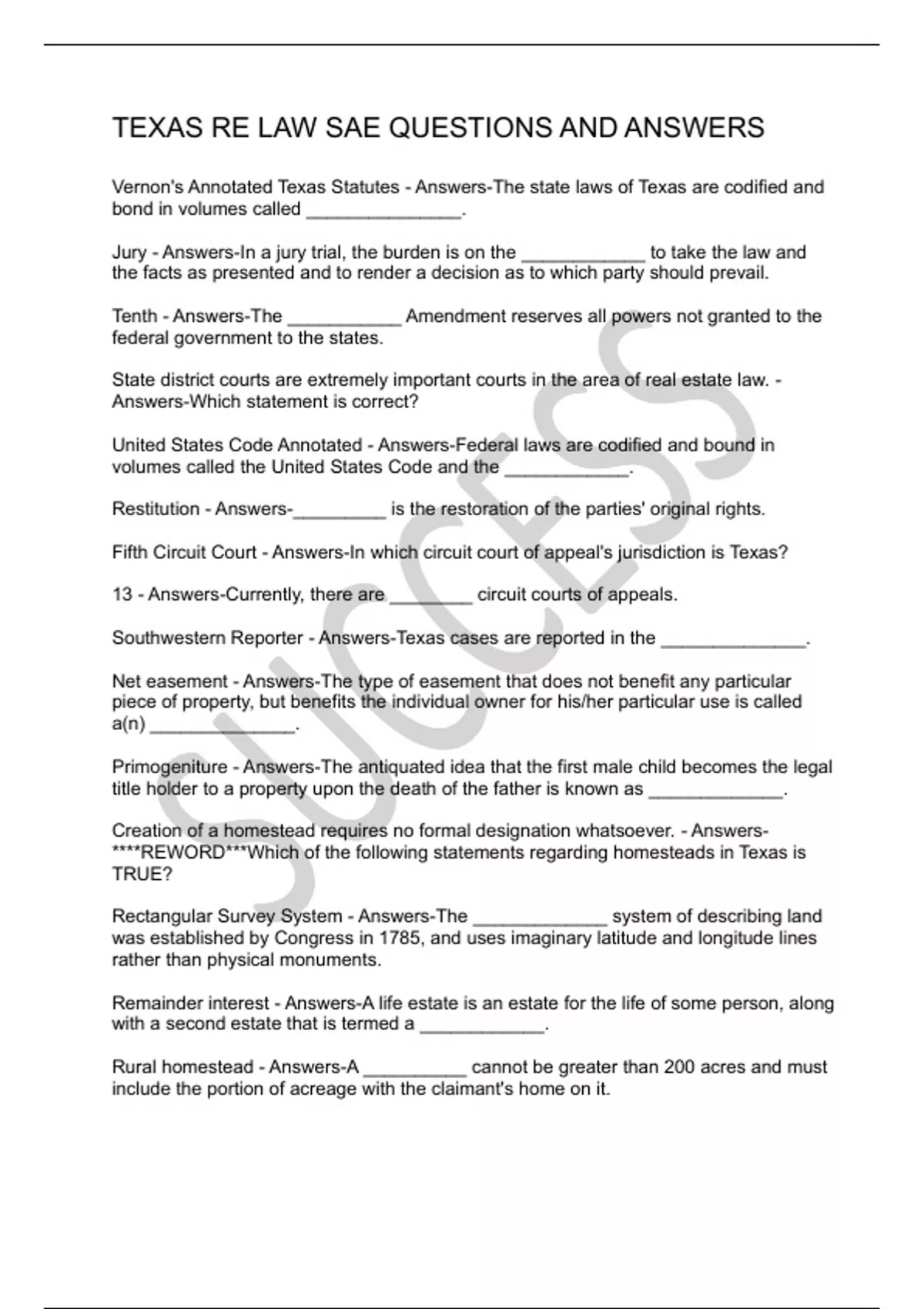 TEXAS RE LAW SAE QUESTIONS AND ANSWERS