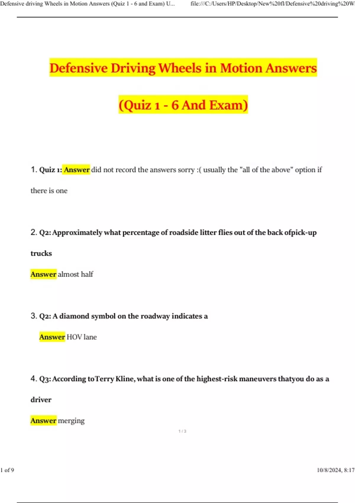 ,Defensive driving Wheels in Motion Answers (Quiz 1 - 6 and Exam) U... file:///C:/Users/HP/Desktop/New%20fl/Defensive%20driving%20Wh