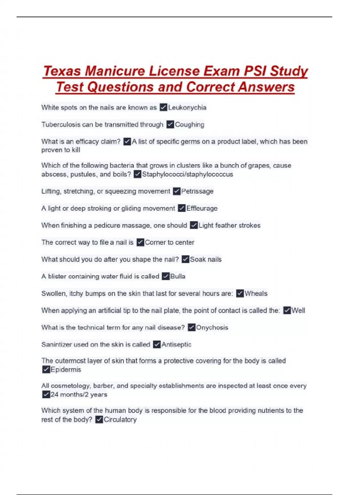Texas Manicure License Exam PSI Study Test Questions and Correct Answers
