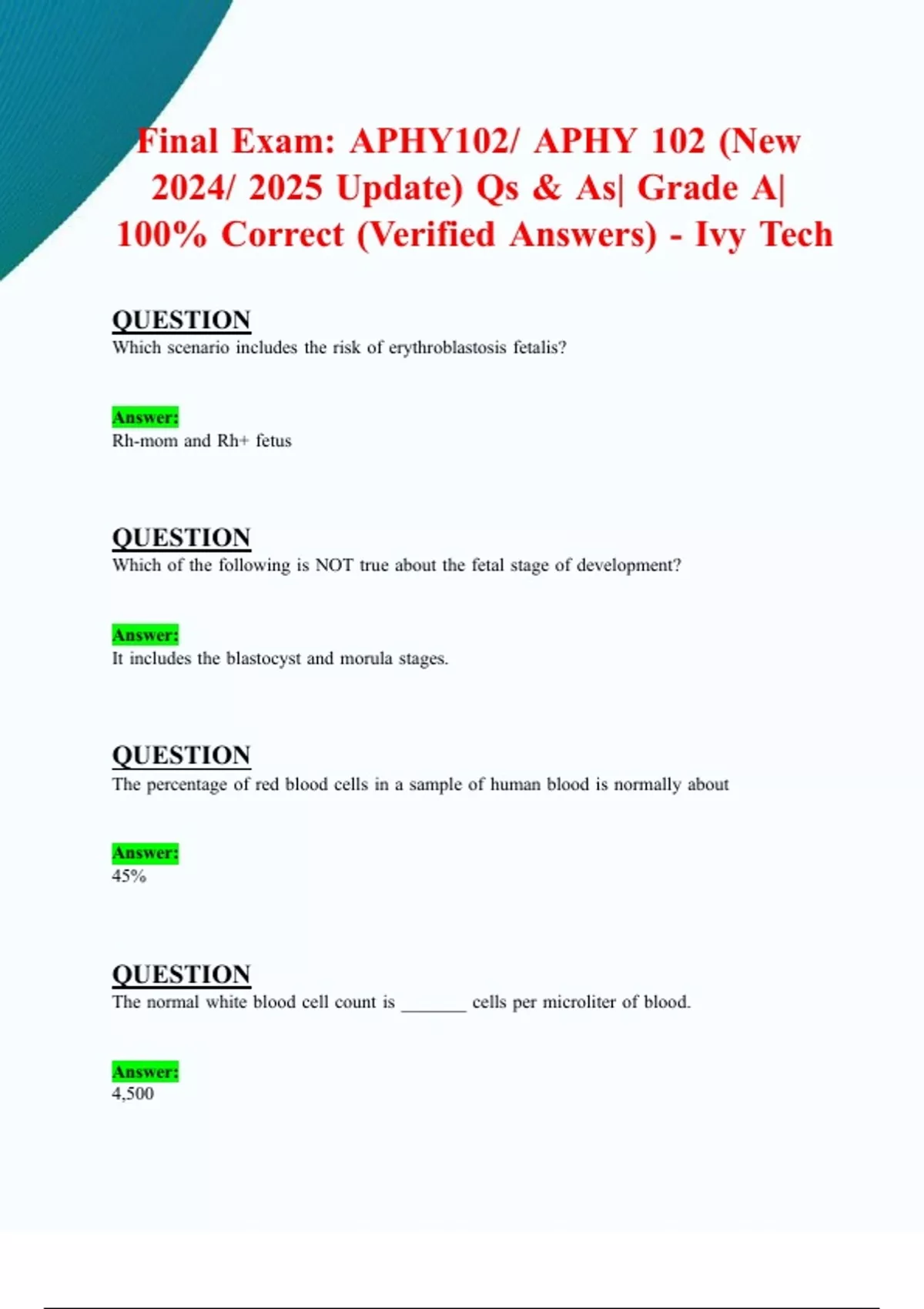 Final Exam: APHY102/ APHY 102 (Latest 2024/ 2025 Update) Qs & As| Grade A| 100% Correct (Verified Answers) - Ivy Tech Q: Secretions that affect only nearby cells are termed Answer: paracrine. Q: Exocrine glands differ from endocrine glands in that exocrine glands Answer: secrete through ducts or tubes to the body's exterior. Q: The placenta allows Answer: oxygen and nutrients to diffuse from maternal blood to the embryo. Q: Passive aging is Answer: a breakdown of structures and slowing of functions. Q: What must be present for any type of hormone to be able to act on a target cell? Answer: Protein receptors Q: Which of the following hormones is released when blood glucose levels are elevated? Answer: Insulin Q: Which of the following is not part of the female reproductive system? Answer: The bulbourethral gland Q: Which is true? (Male reproductive system) Answer: All of the choices are correct. Q: An organism's phenotype determines its genotype. Answer: False Q: A karyotype is Answer: a size-ordered chart of chromosomes. Q: What organ system would include the heart and blood vessels? Answer: Cardiovascular Q: Steroid hormones are lipid-soluble which allows them to pass directly through the plasma membrane of cells. Answer: True Q: What component of blood accounts for the largest proportion of the blood volume? Answer: Plasma Q: Which scenario includes the risk of erythroblastosis fetalis?