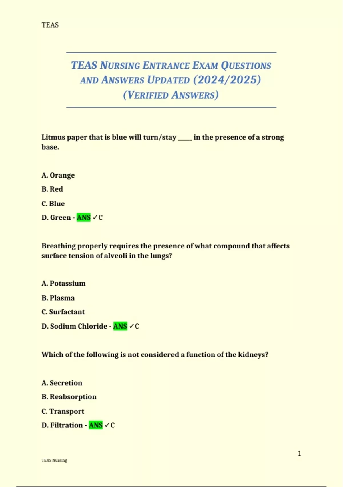 TEAS NURSING ENTRANCE EXAM QUESTIONS