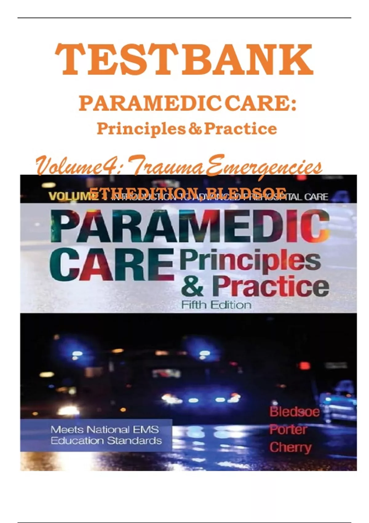TEST BANK Paramedic Care: Principles & Practice Volume 4: Trauma Emergencies 5th Edition, Bledsoe Chapter 1: Trauma and Trauma Systems Chapter 2: Mechanism of Injury Chapter 3: Hemorrhage and Shock Chapter 4: Soft-Tissue Trauma Chapter 5: Burns Chapter 6: Head, Neck, and Spinal Trauma Chapter 7: Chest Trauma Chapter 8: Abdominal and Pelvic Trauma Chapter 9: Orthopedic Trauma Chapter 10: Environmental Trauma Chapter 11: Special Considerations in Trauma