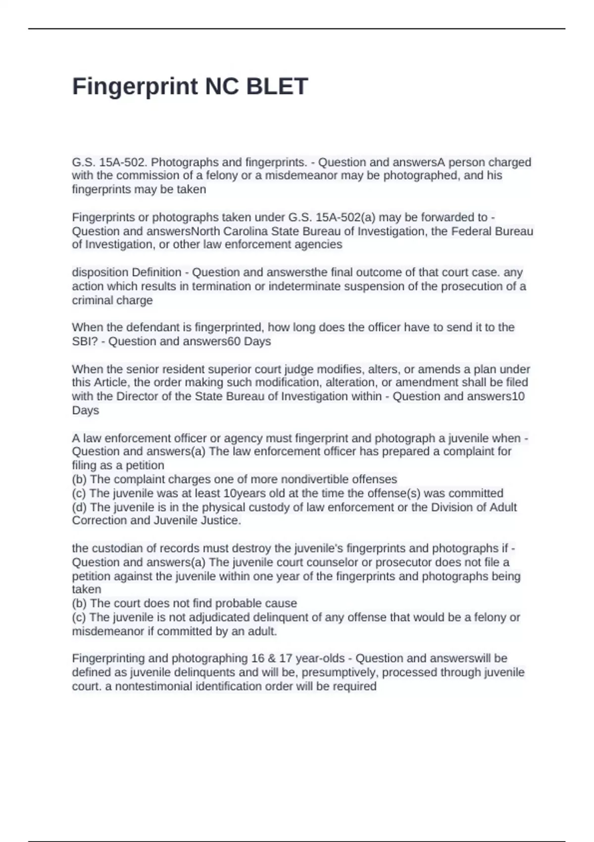 Fingerprint NC BLET Exam with Questions and Correct Answers
