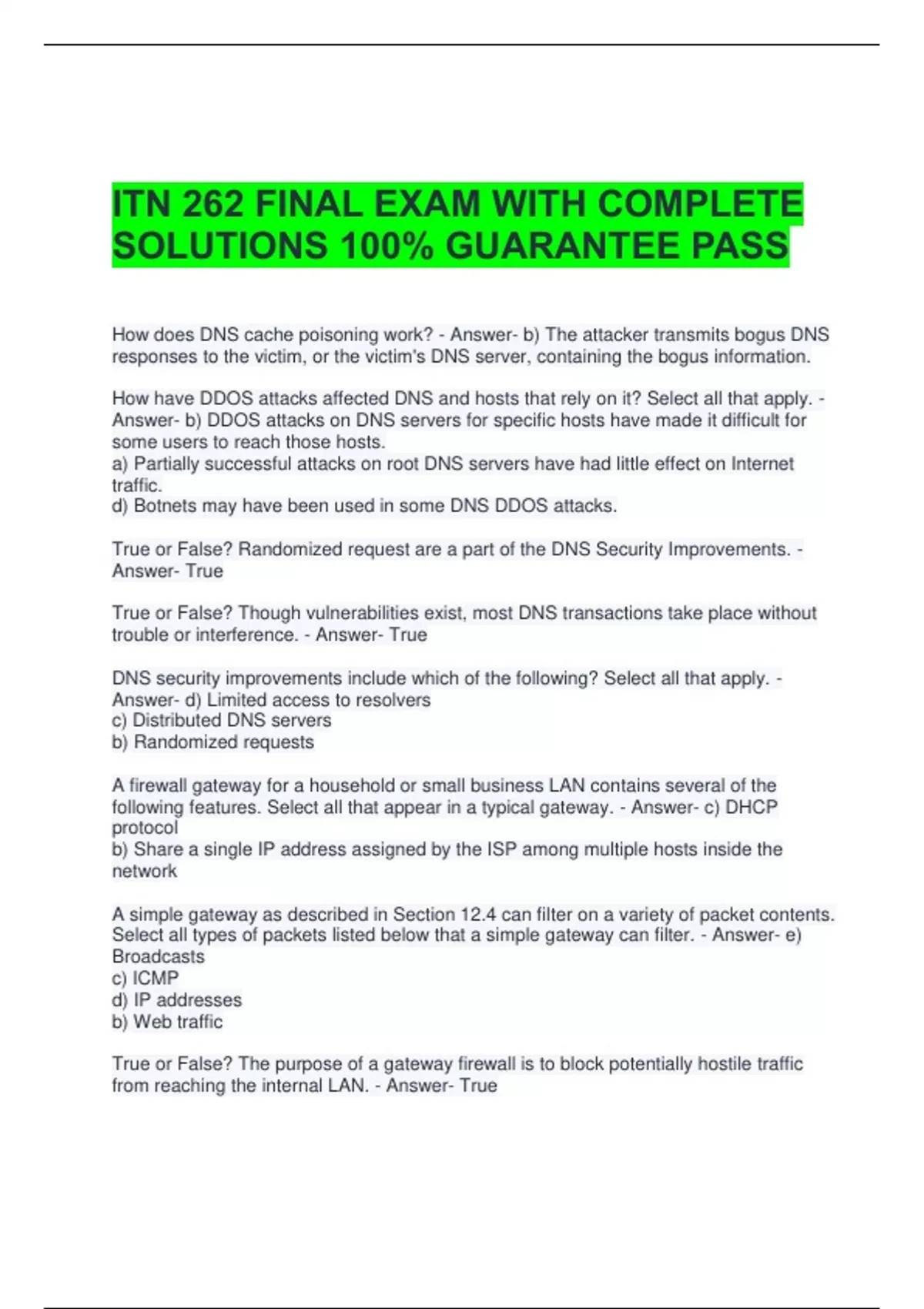 ITN 262 FINAL EXAM WITH COMPLETE SOLUTIONS 100% GUARANTEE PASS How does DNS cache poisoning work? - Answer- b) The attacker transmits bogus DNS responses to the victim, or the victim's DNS server, containing the bogus information. How have DDOS attacks affected DNS and hosts that rely on it? Select all that apply. - Answer- b) DDOS attacks on DNS servers for specific hosts have made it difficult for some users to reach those hosts. a) Partially successful attacks on root DNS servers have had little effect on Internet traffic. d) Botnets may have been used in some DNS DDOS attacks. True or False? Randomized request are a part of the DNS Security Improvements. - Answer- True True or False? Though vulnerabilities exist, most DNS transactions take place without trouble or interference. - Answer- True DNS security improvements include which of the following? Select all that apply. - Answer- d) Limited access to resolvers c) Distributed DNS servers b) Randomized requests A firewall gateway for a household or small business LAN contains several of the following features. Select all that appear in a typical gateway. - Answer- c) DHCP protocol b) Share a single IP address assigned by the ISP among multiple hosts inside the network A simple gateway as described in Section 12.4 can filter on a variety of packet contents. Select all types of packets listed below that a simple gateway can filter. - Answer- e) Broadcasts c) ICMP d) IP addresses b) Web traffic True or False? The purpose of a gateway firewall is to block potentially hostile traffic from reaching the internal LAN. - Answer- True