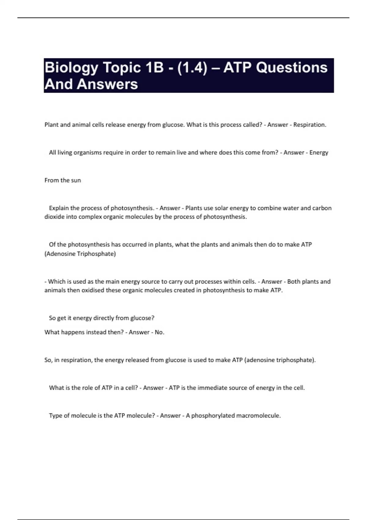 Biology Topic 1B - (1.4) – ATP Questions And Answers